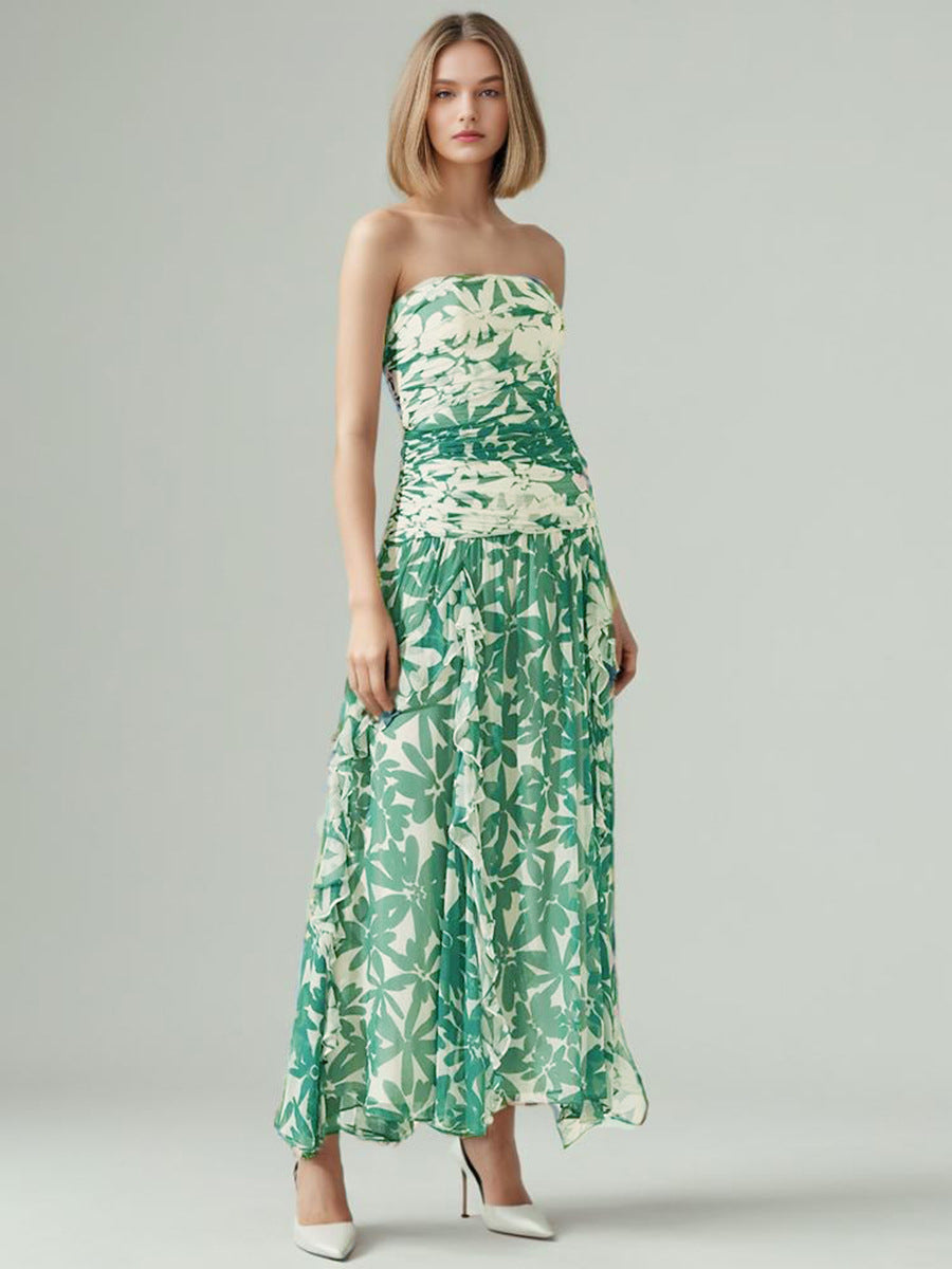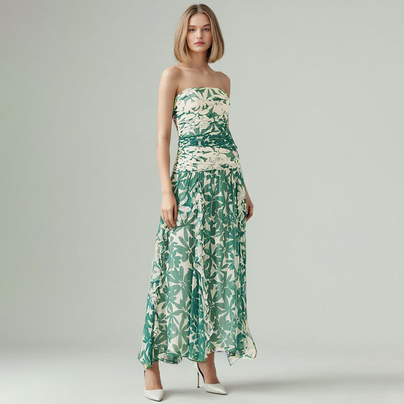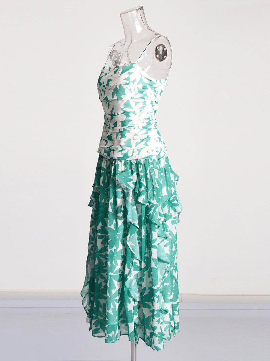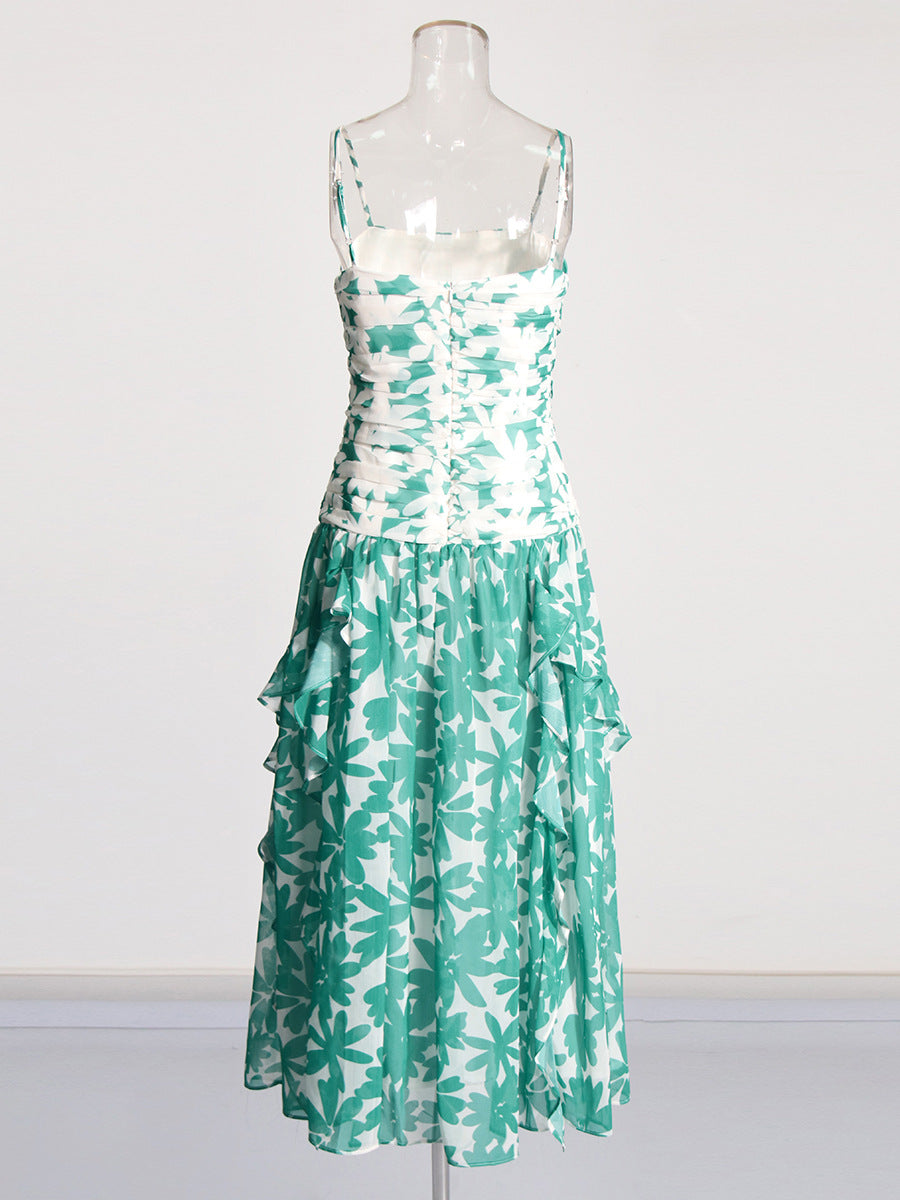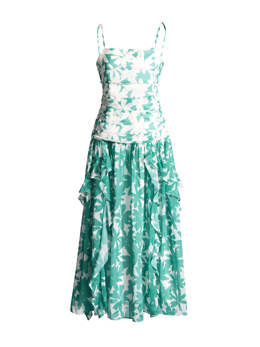 Holiday Style Dress 2025 Spring New Print Pressure Frills Light Mint Leaf Side Braid Dress Woman