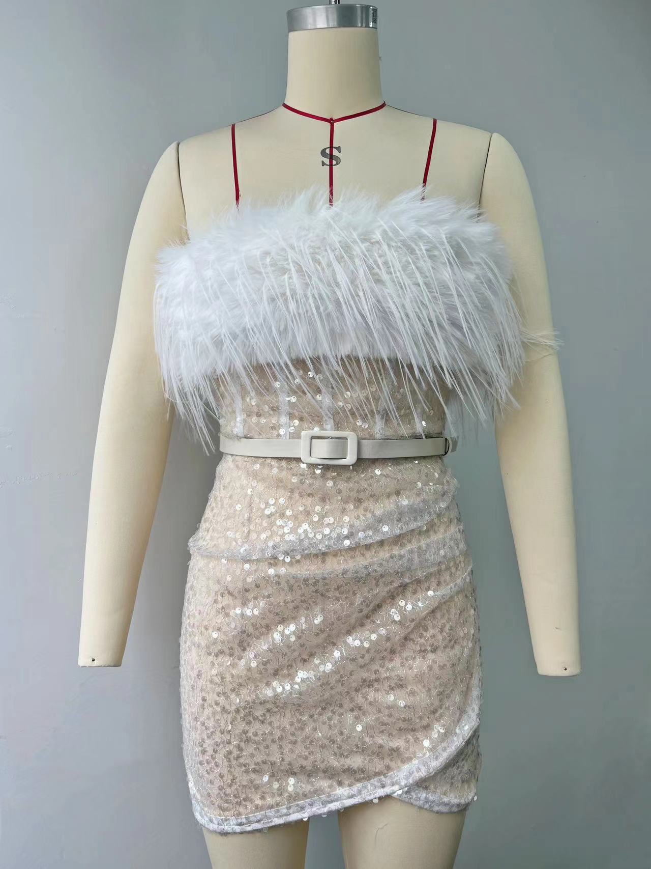 Hot Short Dress High-Waist Sexy Squine Dress One-Word Shoulder Feather Dress
