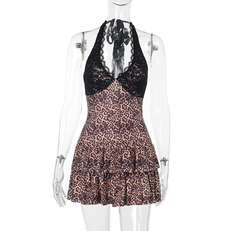 Lace Leopard Splicing Hanging Neck Ultra-Short Sexy Panties Summer Vacation Babes Shorts DJPT