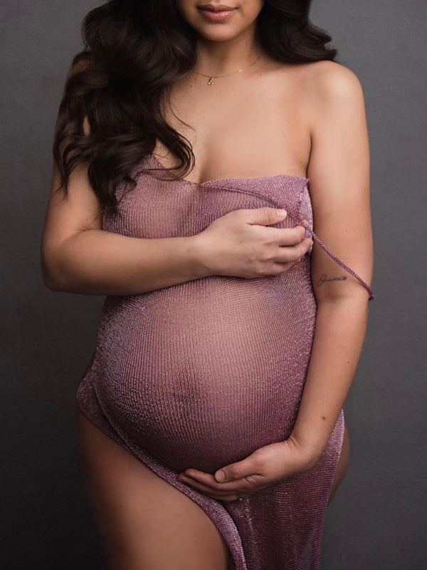 Light Pink Cut Out Double Slit Sheer Knitting Mesh Beach Photoshoot Maternity Midi Dress Maternity