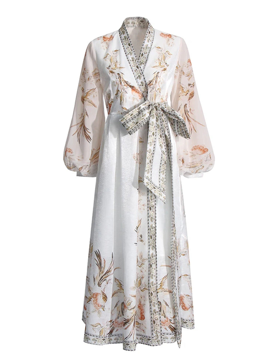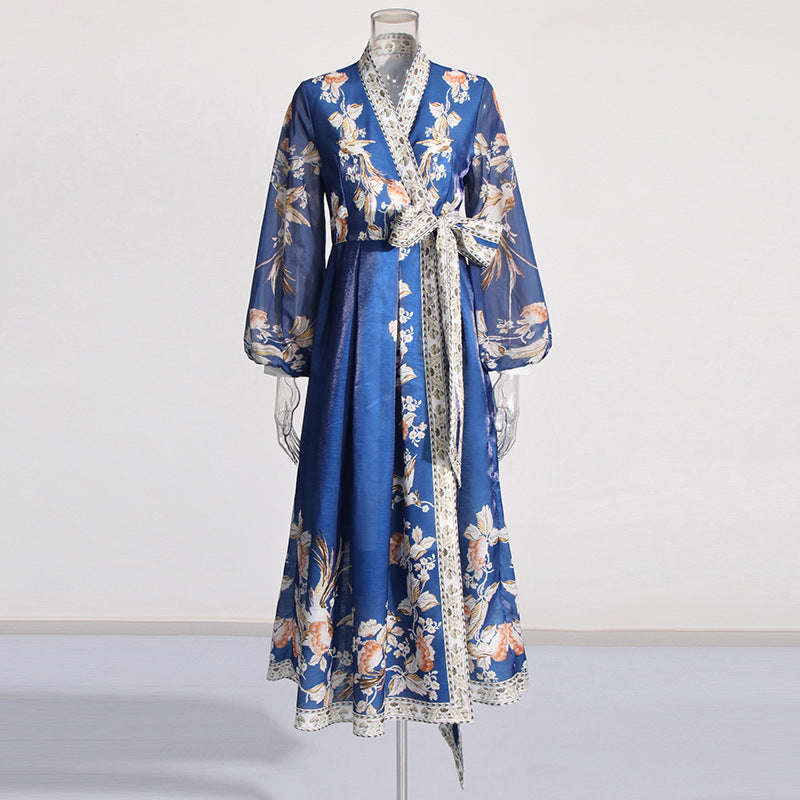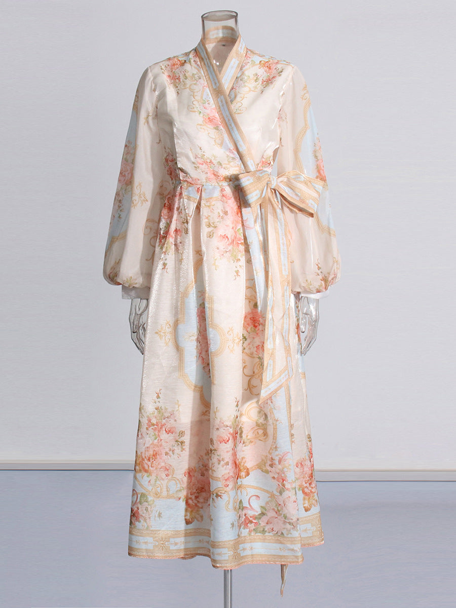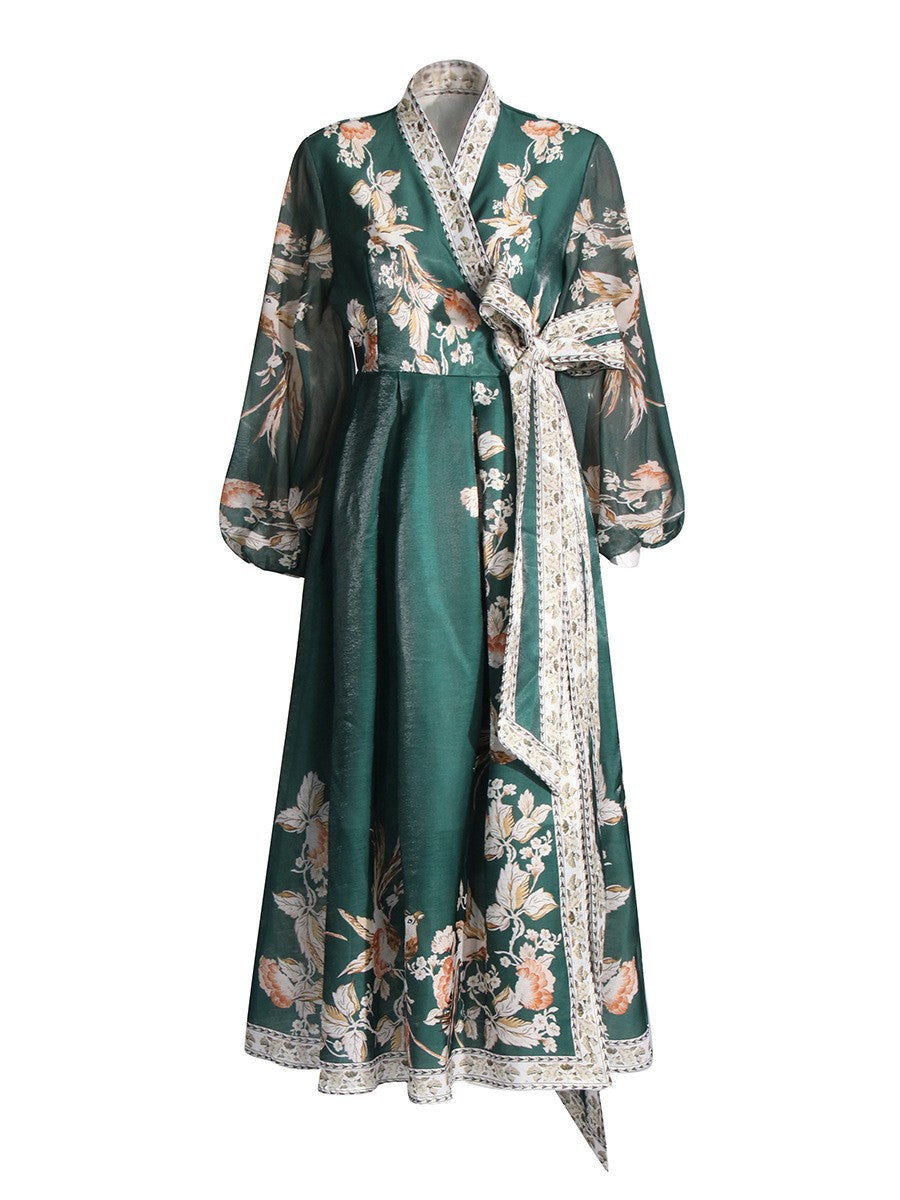 Literary And Art Vintage Dress 2025 Summer New V-Neck Print Lantern Sleeve High-Waisted Dress Woman