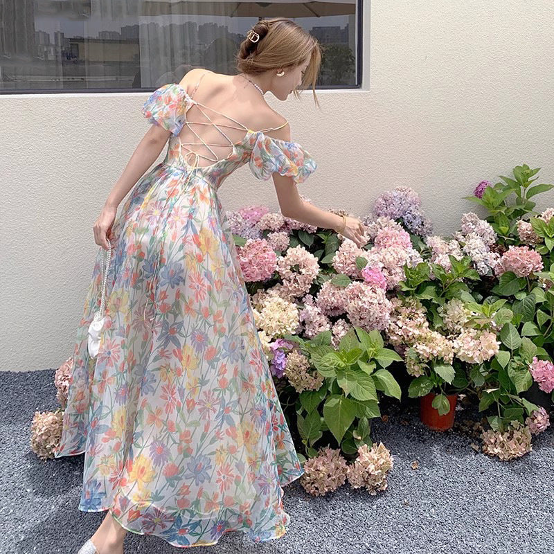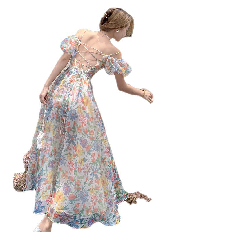 Lusty French Sexy Back One-Word Shoulder Bubble Sleeves Sleeves Hanging Dress Women's Summer Seaside Holiday Dress
