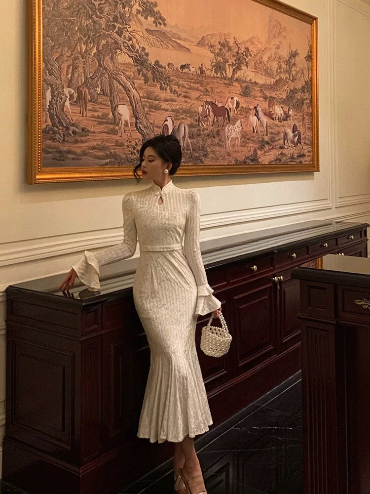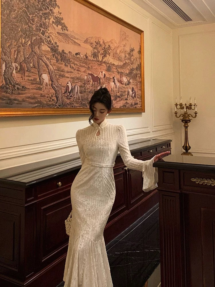 Mermaid High Neckline Ivory Satin Date Night Dress Prom Dresses Birthday Outfits SD1098