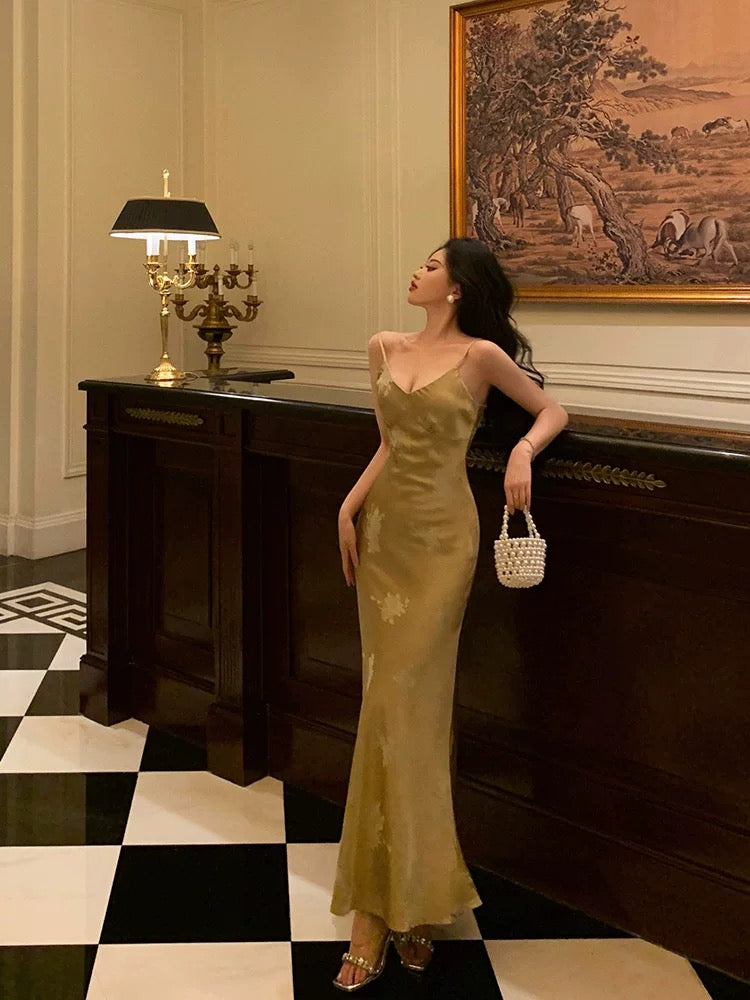 Mermaid Spaghetti Straps Floral Gold Long Prom Dresses Birthday Outfit SD783