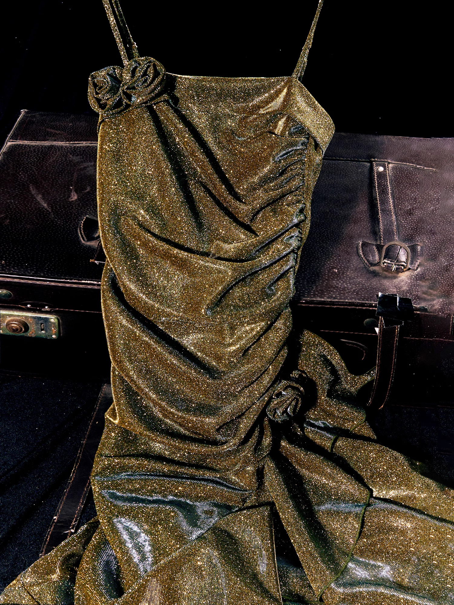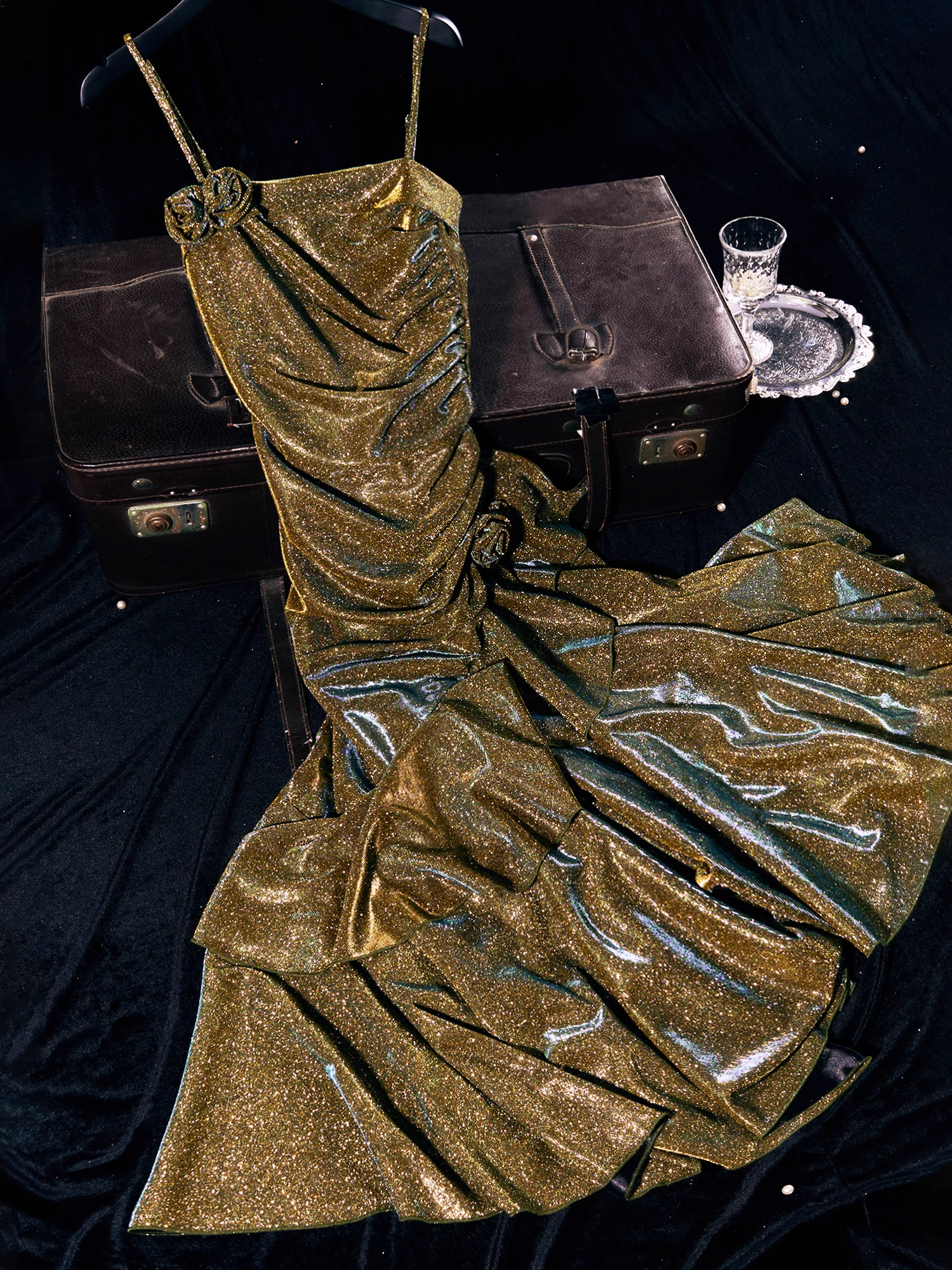 Mermaid Spaghetti Straps Long Gold Sequin Prom Dresses Birthday Outfits With Flowers SD485