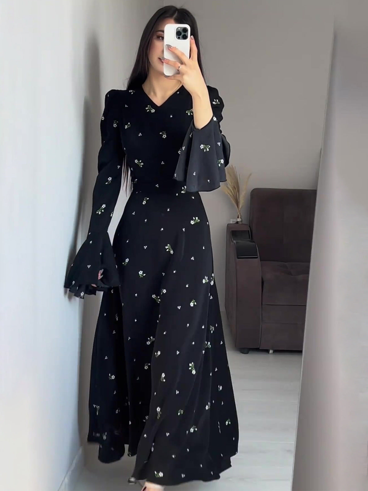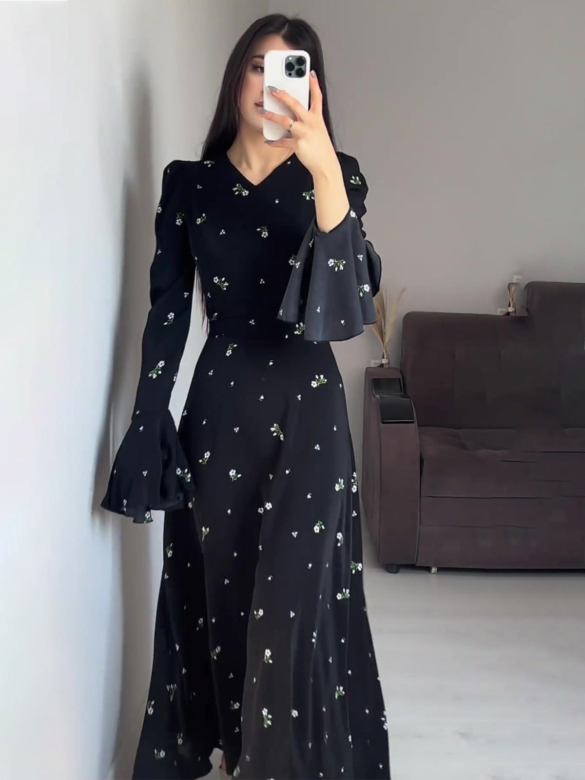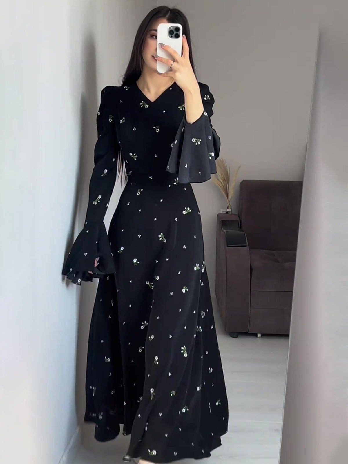 Middle East 2024 Spring New Lotus Leaf Sleeves To Close The Waist And Crushed Flowers Gentle Wind Dress Dress