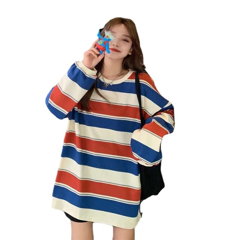 Net Red T-Shirt Women In Rainbow Striped Long-Sleeved Top 2025 Autumn Dress Korean Version Loose Bottoming Shirt DJPT