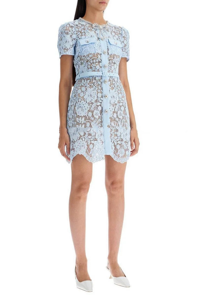 New Designer Tide Brand Hollow Water Soluble Lace Light Blue Lady Temperament Dating Dress