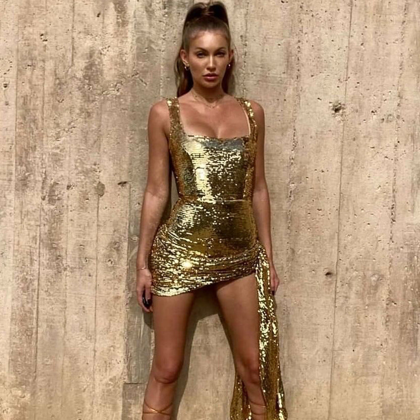 New Evening Dress Repair Height Pocketed Ass And Hips High-End Word-Word Collar Gold Lily Dress