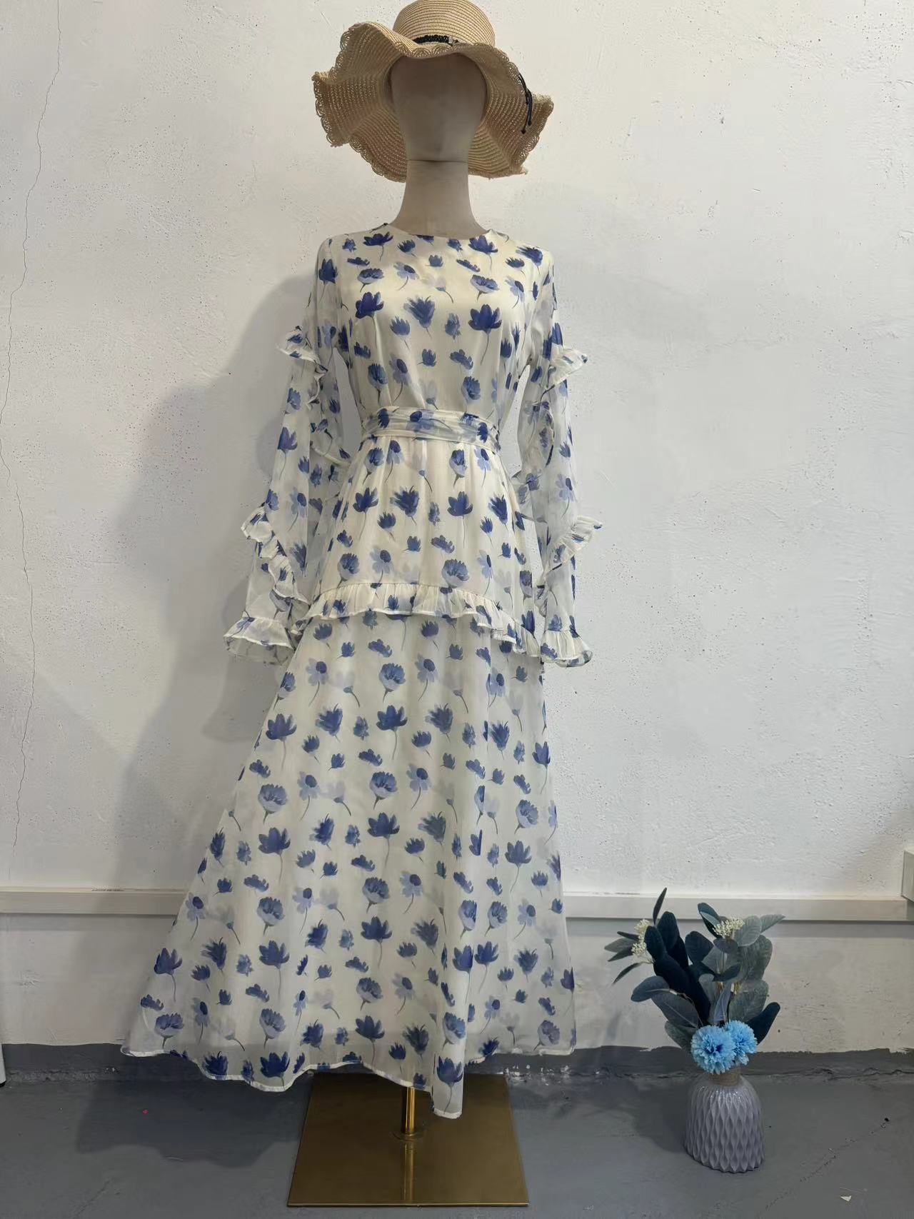 New Gentle Wind Crush Floral Dress Women's Round Collar Long-Sleeved Leaf-Side Dress