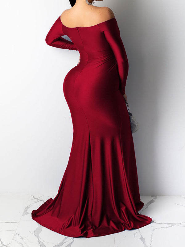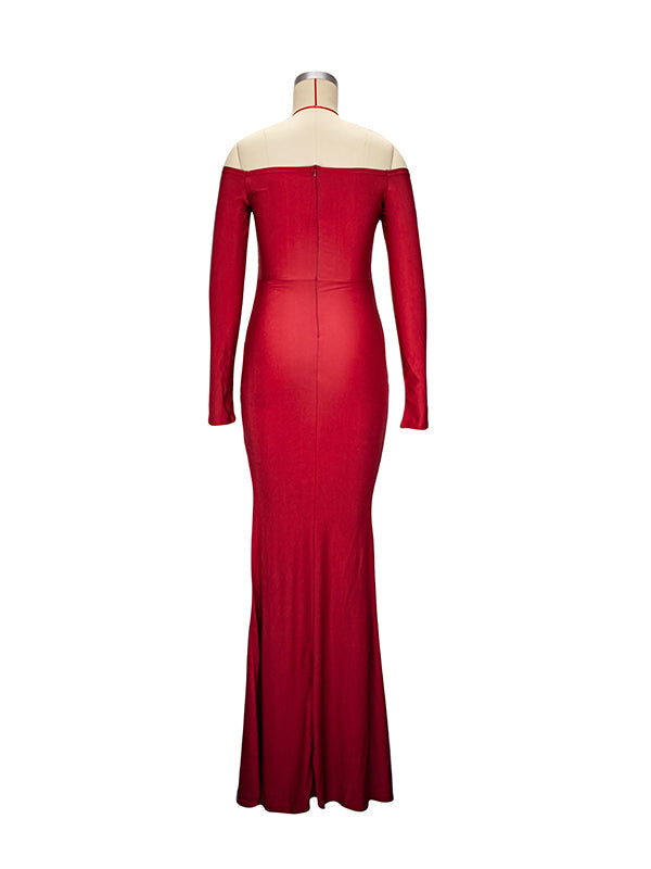 Features?: ?Floor-length, Thigh High Slit, Formal Prom Gowns, Off the Shoulder, V Neck,? Elegant, Long Sleeve, Bodycon, Fishtail, Solid Color, Slim Fit, Maxi Dress, Evening Prom Gown. The gorgeous look is sure to shine all season long