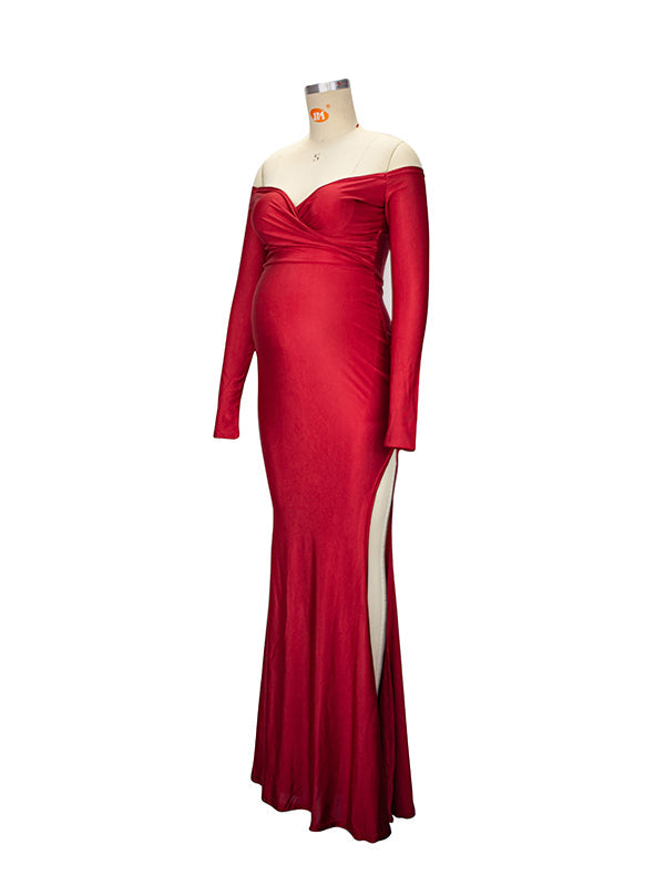 Off Shoulder Long Sleeve Slit Bodycon Solid Baby Shower Party Evening Gown Maternity Maxi Dress Maternity