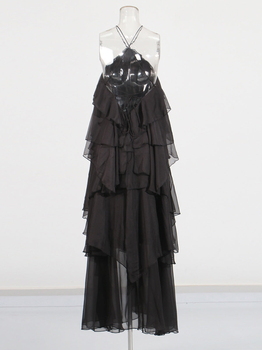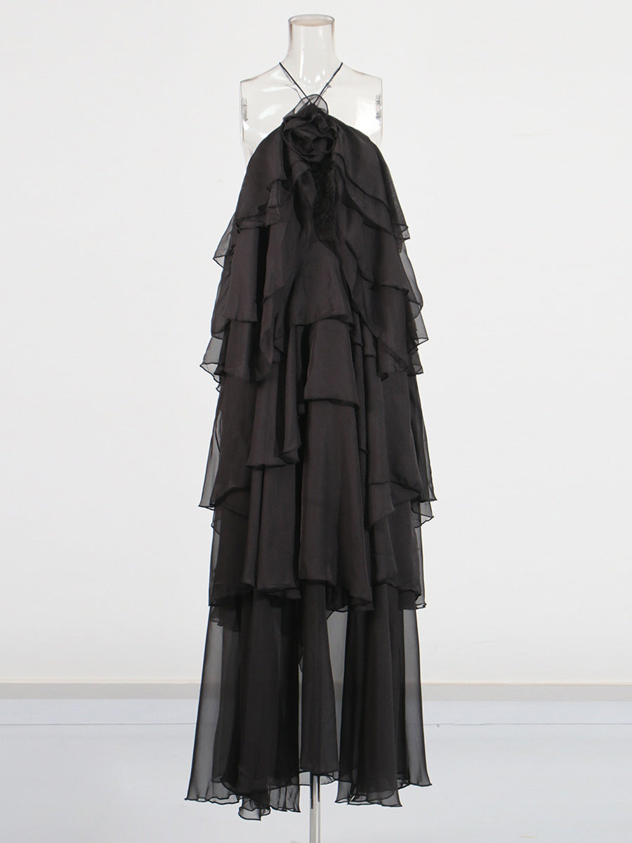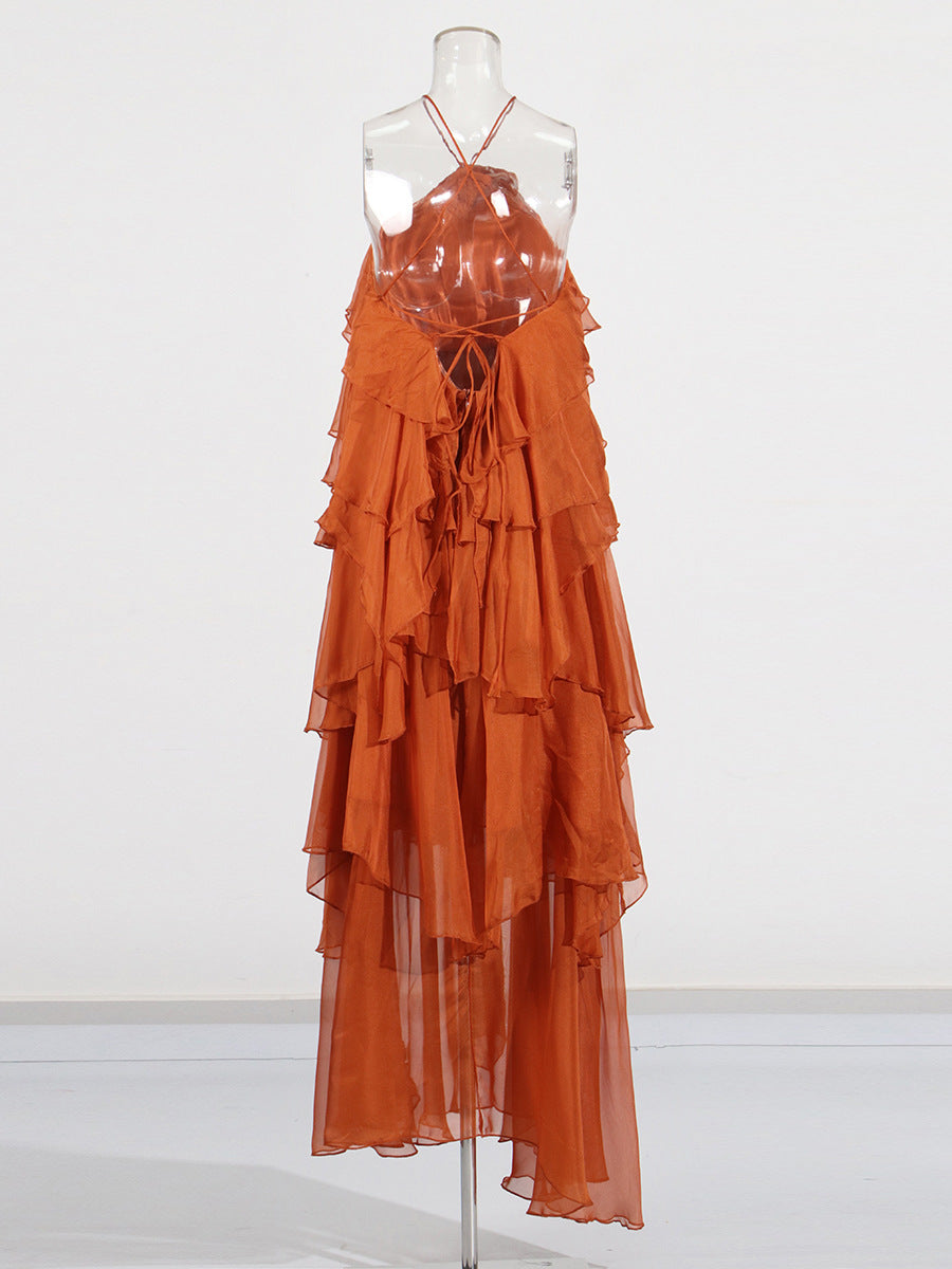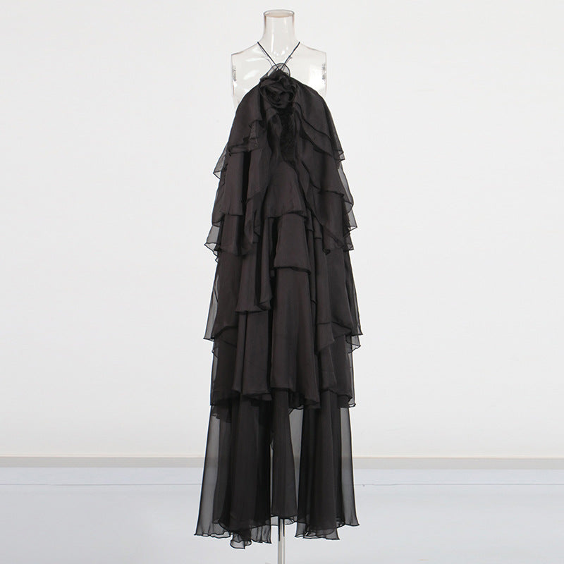 Personality Niche Hanging Neck Dress 2025 Summer New Lotus Leaf Side Splicing Solid Color Flower Dress Dress Woman