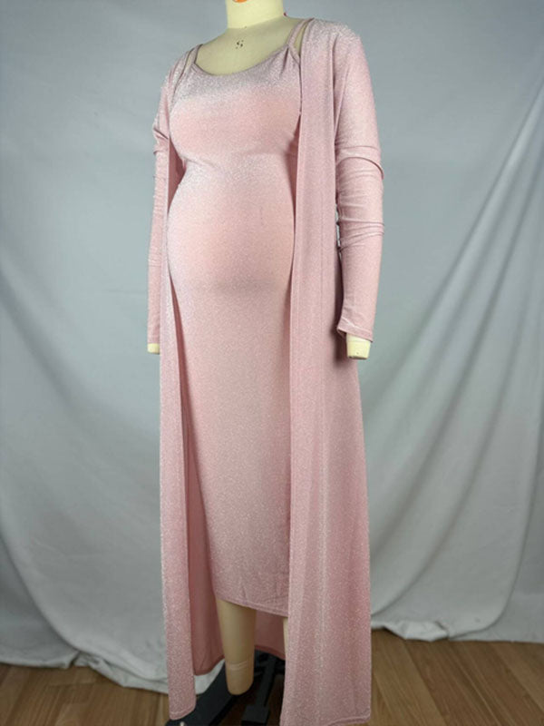 Pink Bright Wire Long Sleeve 2-in-1 Glitter Bodycon Party Cute Baby Shower Plus Size Cardigan Set Maternity Midi Dress Maternity