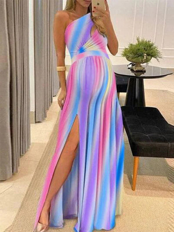 Rainbow Pink & Blue Off Shoulder Cut Out Ruffle Slit Side Irregular Gender Reveal Dress Maternity Maxi Dress Maternity