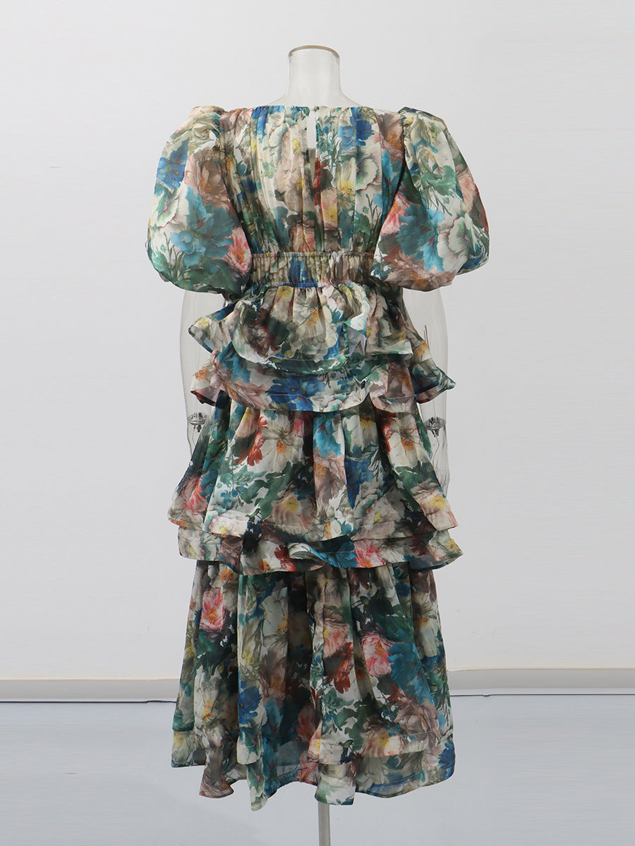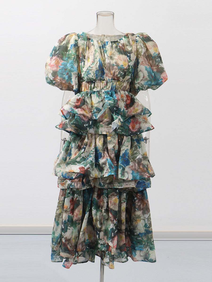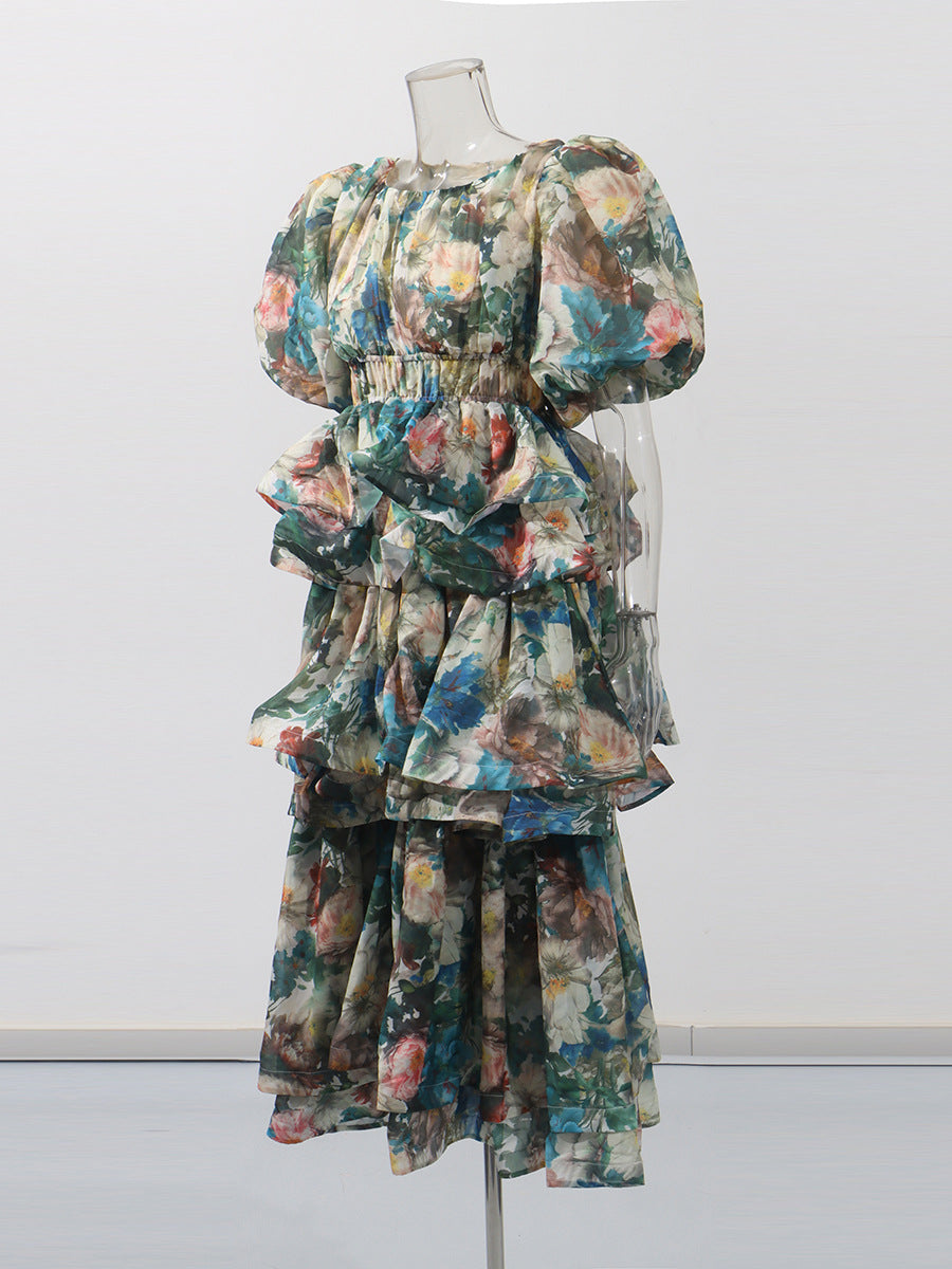 Retro Court Dress 2025 Summer New Multi-Layer Lotus Side Bubble Sleeve Print Dress Dress Woman