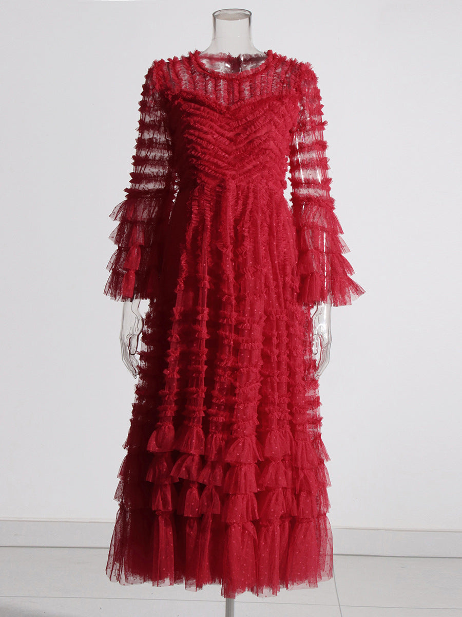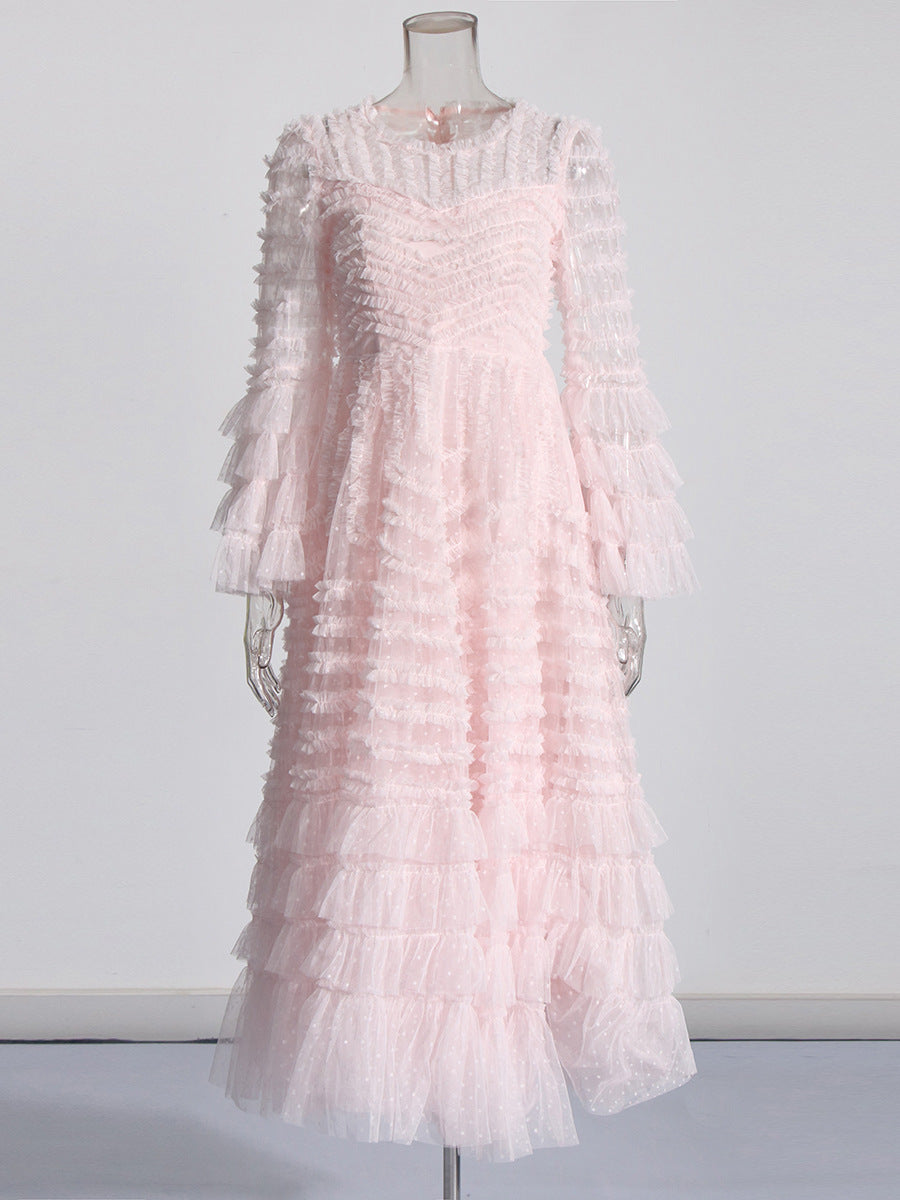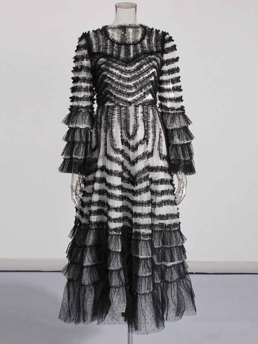 Retro Style Personality 2025 Summer New Round Collar Long Horn Sleeve Wood Ear Mesh Mesh Stitching Dress