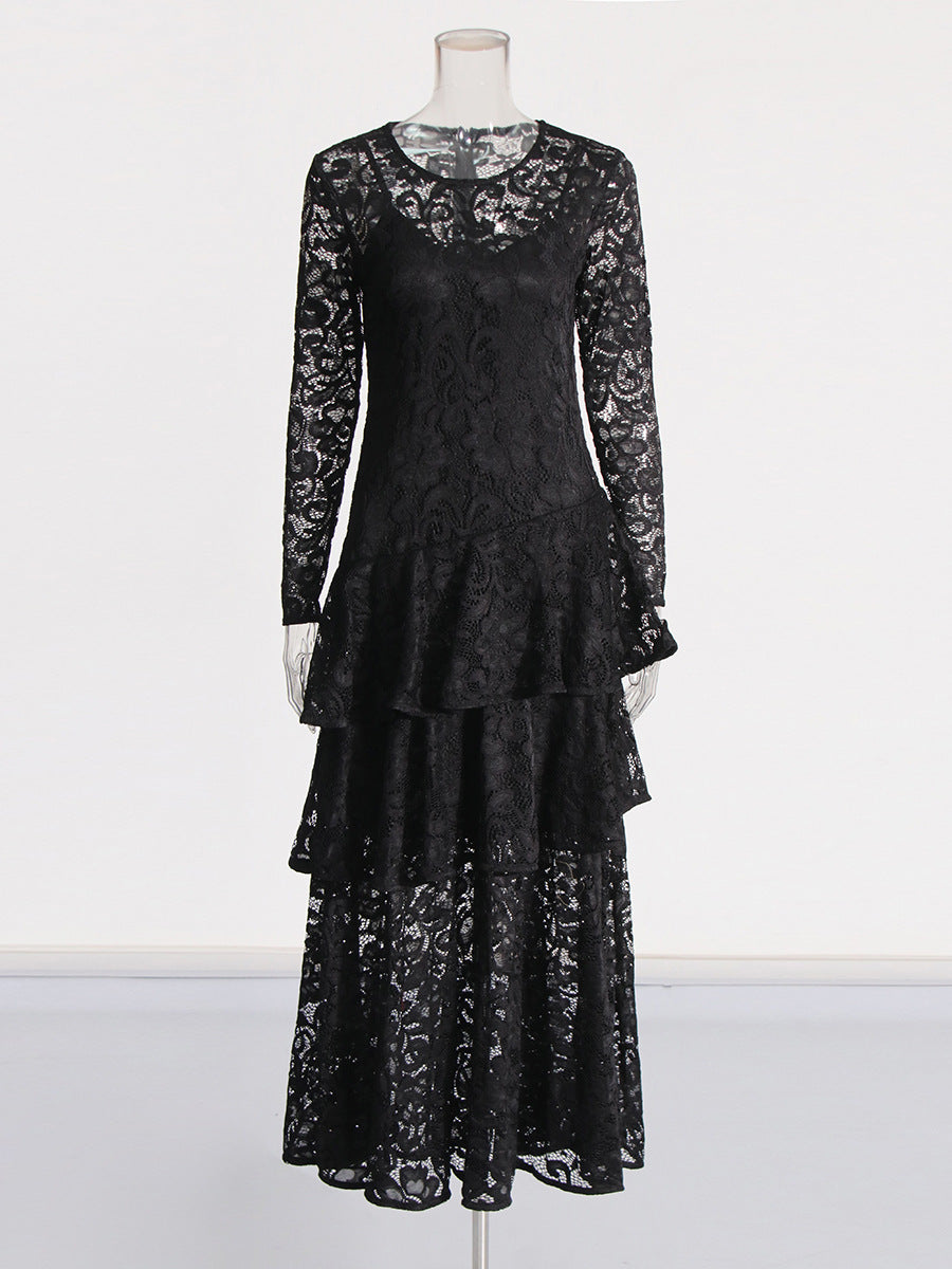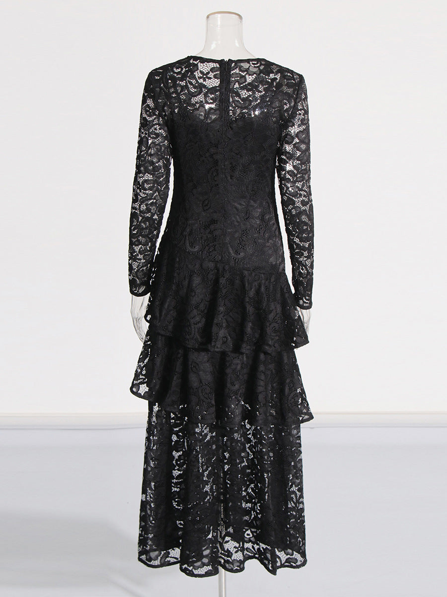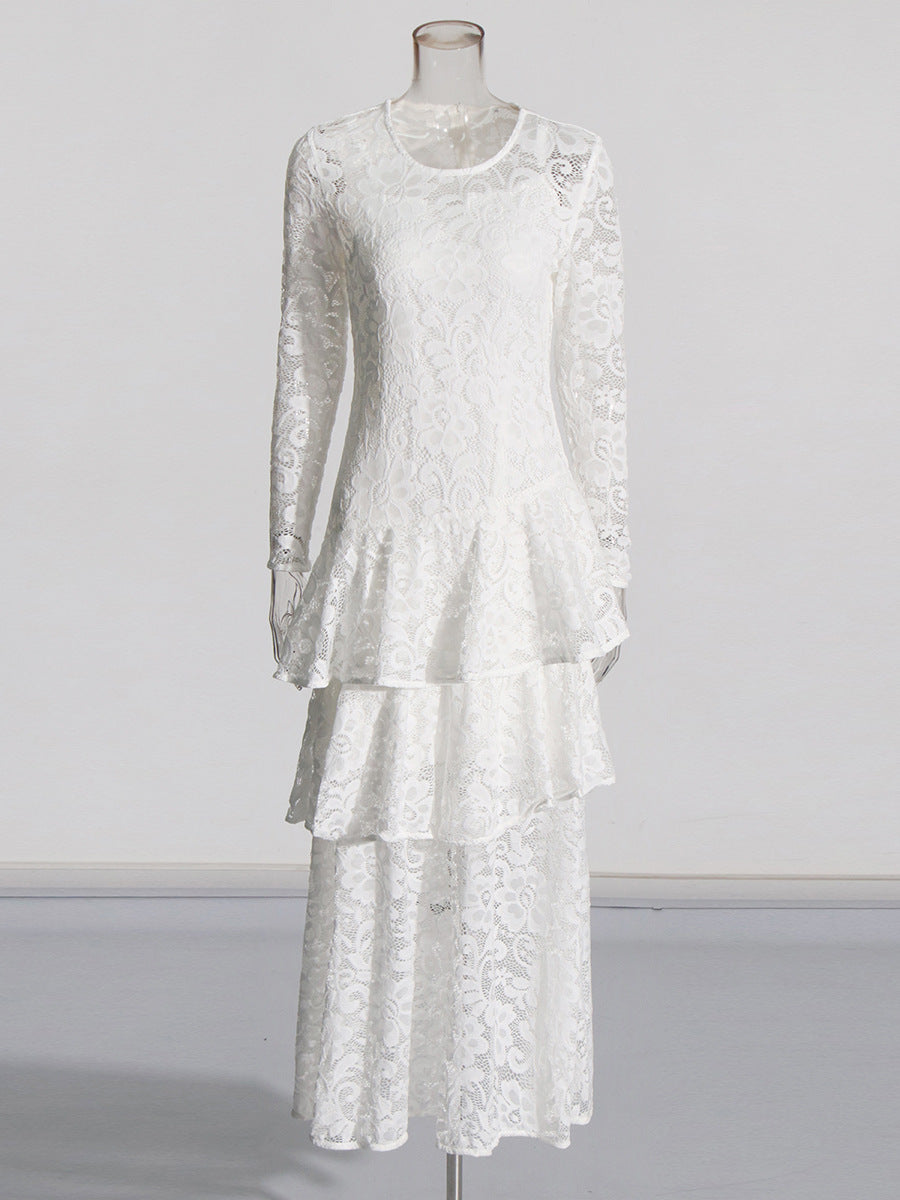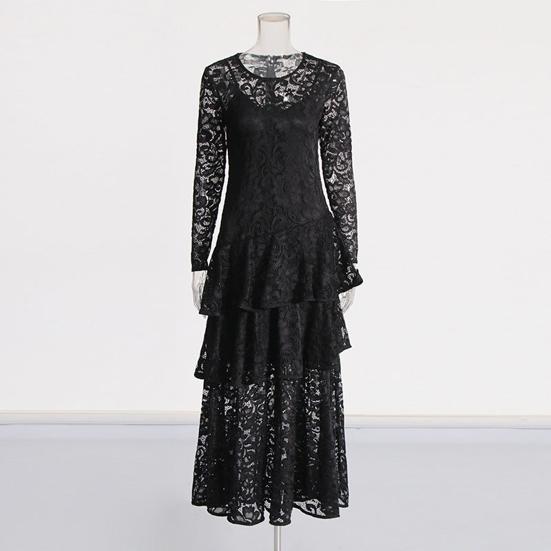 Retro Style Small Lotus Leaf Side Dress 2025 High-End New Round-Neck Long-Sleeved Lace Hollow Dress