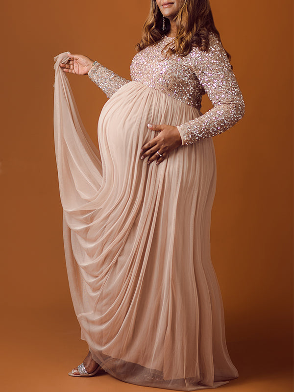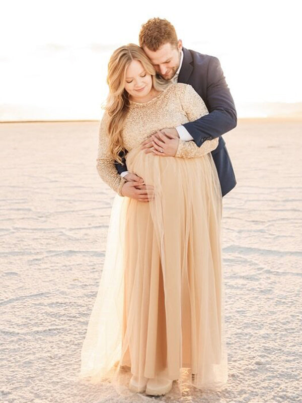 Sequin Tulle Splicing Long Sleeve Party Gown Photoshoot Maternity Baby Shower Maxi Dress Maternity