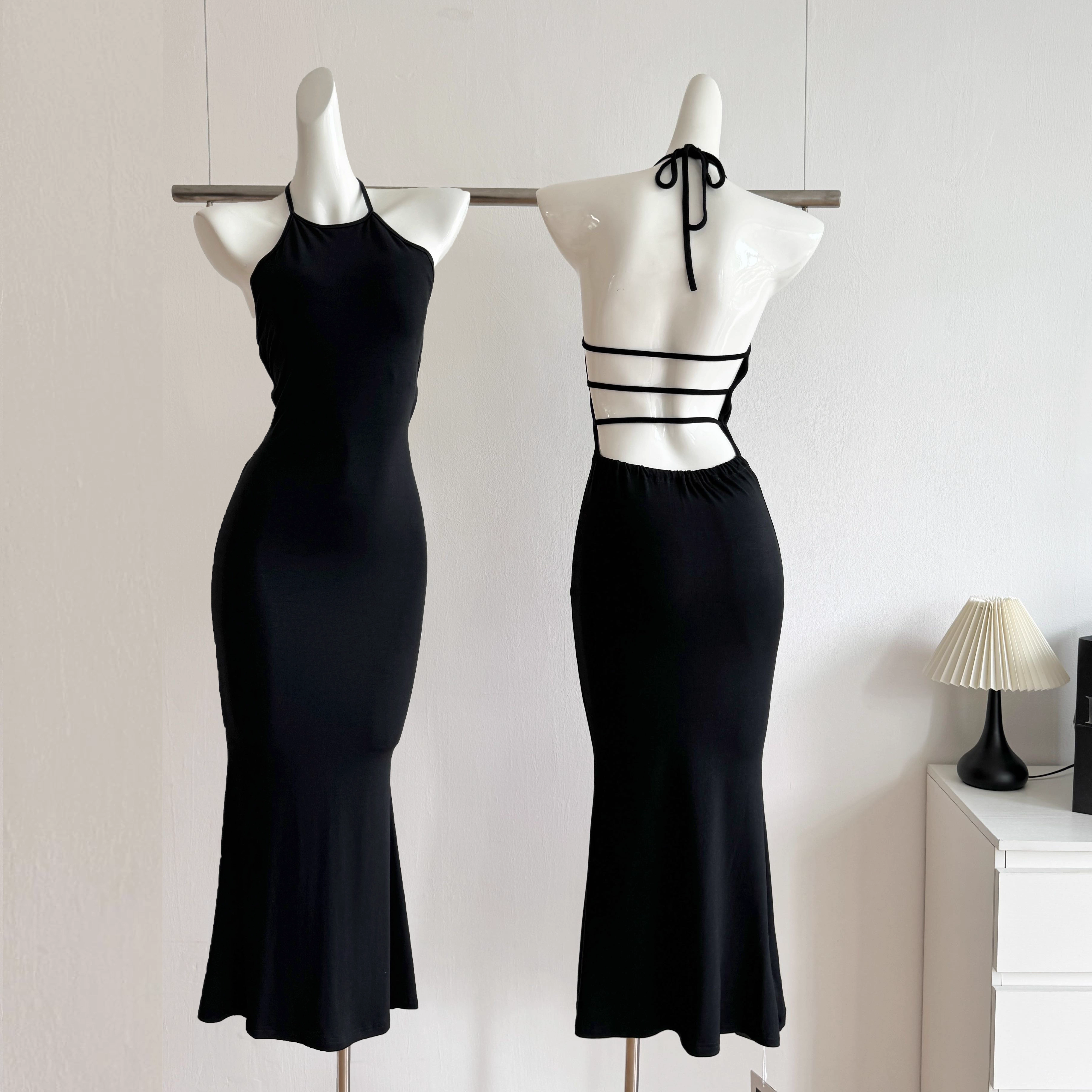 Sheath Halter Black Dinner Dresses Mid Length Black Birthday Outfit SD287