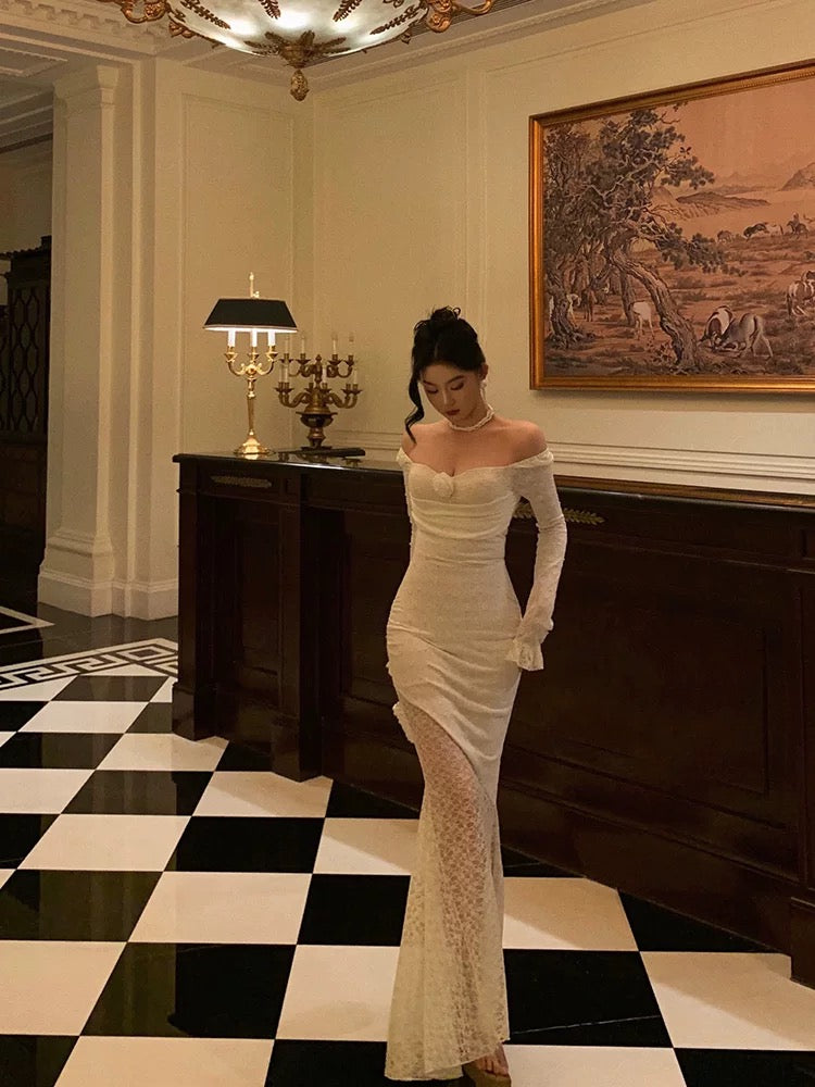 Sheath Off The Shoulder Long Sleeves Lace Prom Dresses Evening Dress SD426