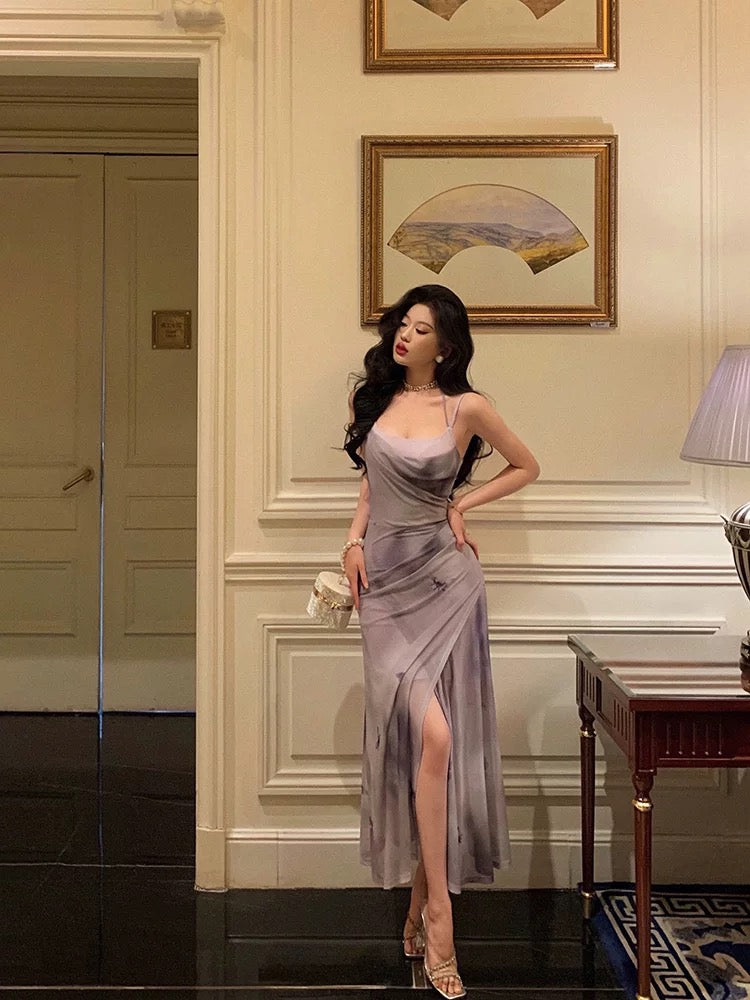 Sheath Spaghetti Straps Purple Butterfly Satin Slit Prom Dresses Birthday Outfits SD700