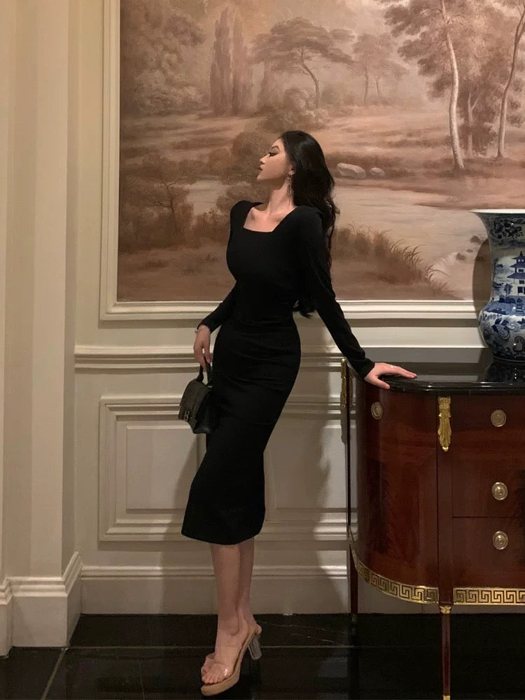 Sheath Square Neckline Black Prom Dresses Birthday Outfits Evening Gown SD937