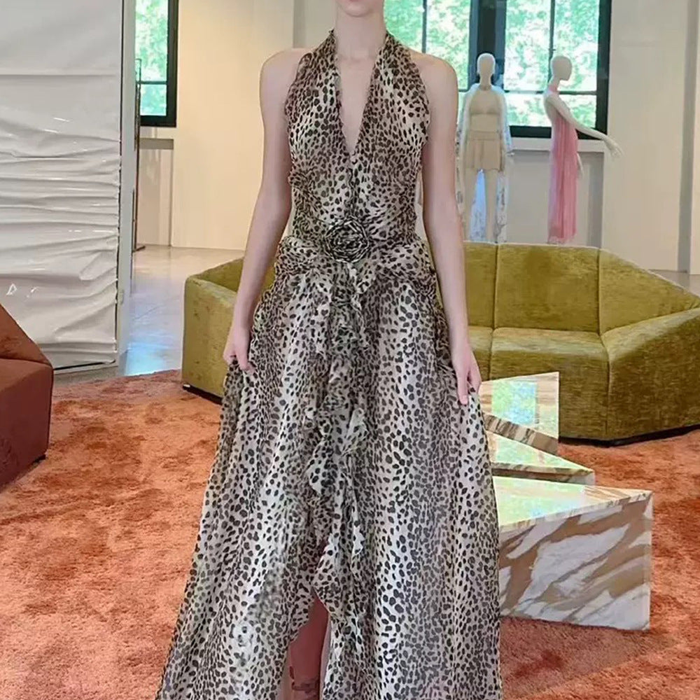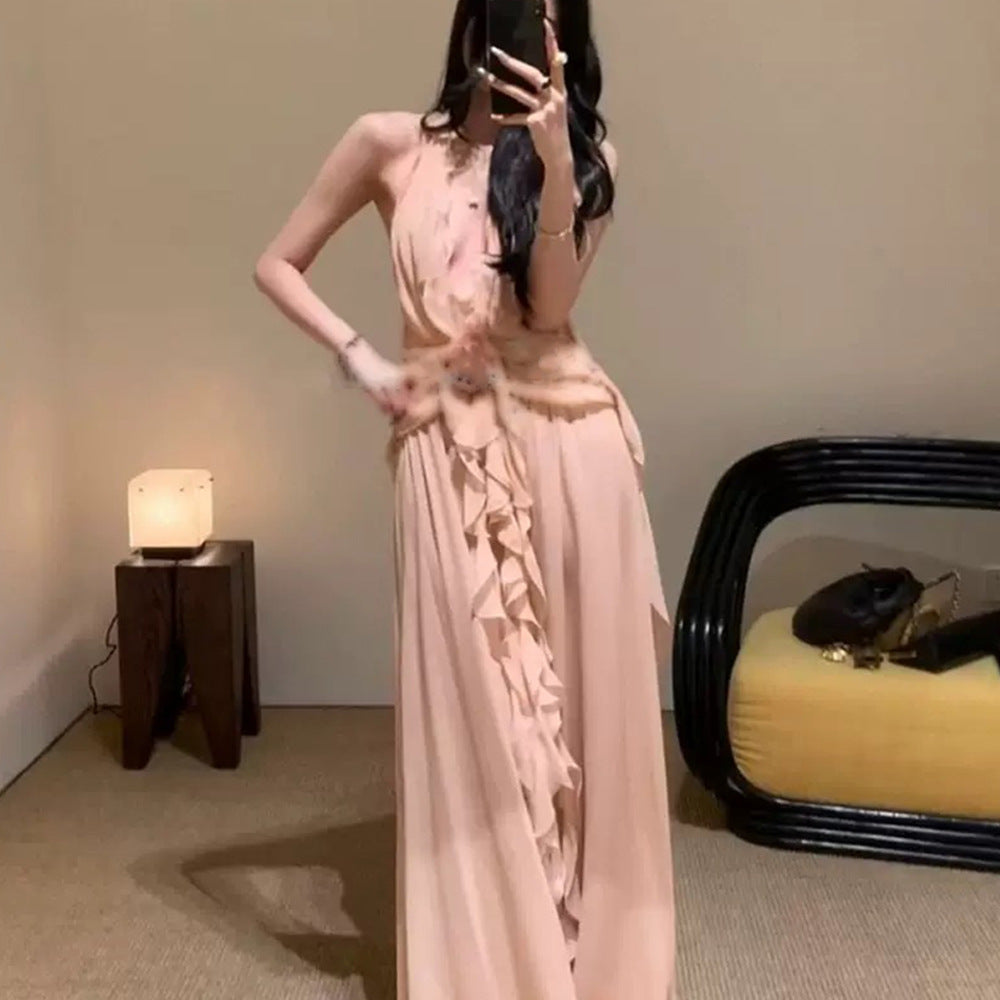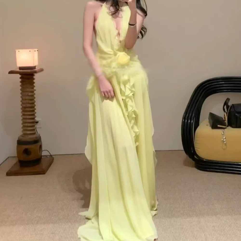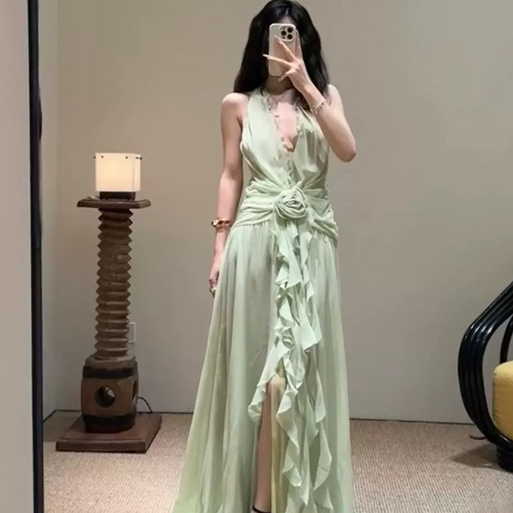 Sleeveless V-Necked Neck Dress With Wooden Ears Exposed Back Long Dress Beach Beach Seaside Holiday Dress