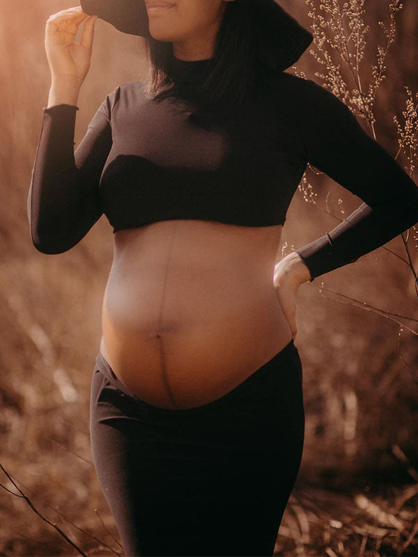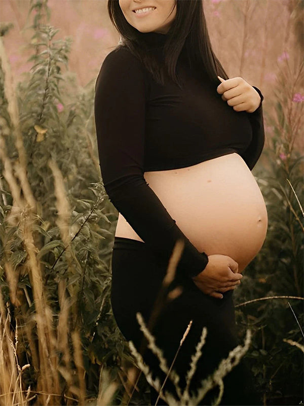 Solid Color Ruffle High Neck Crop Top 2-in-1 Long Sleeve Bodycon Club Party Photoshoot Maternity Maxi Dress Maternity