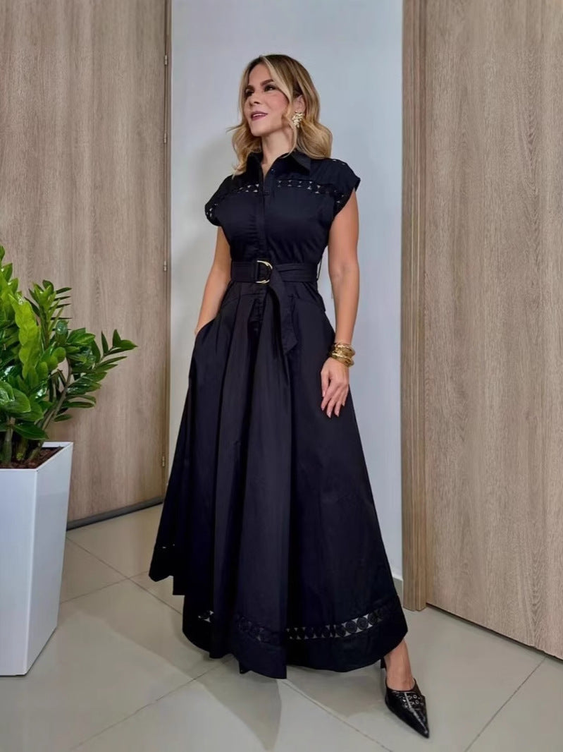 Spring And Summer Holiday Wind Collar Lace Splicing Hollow Belt Shirt Dress Dress