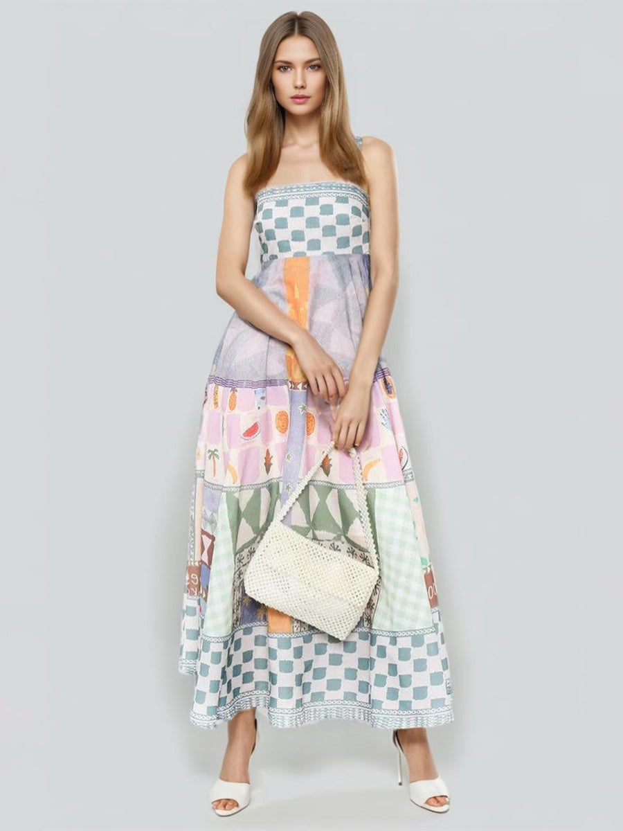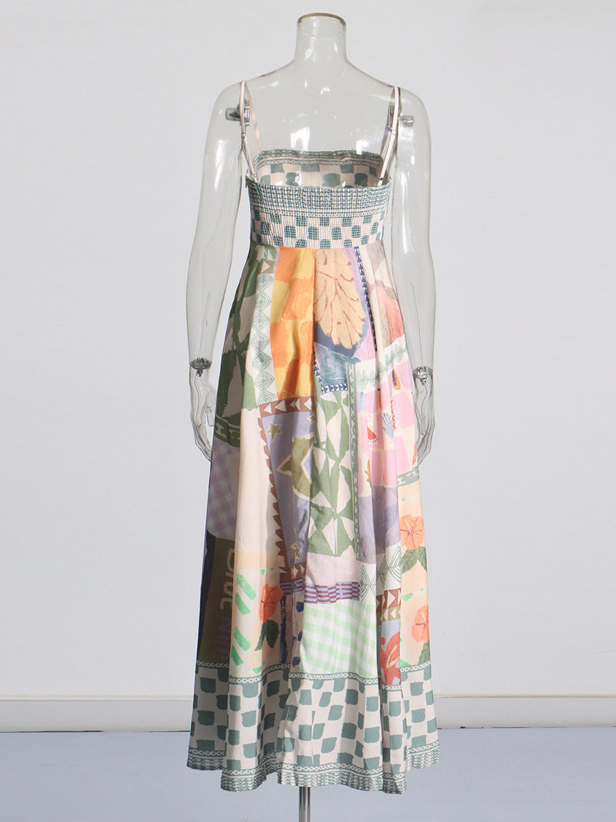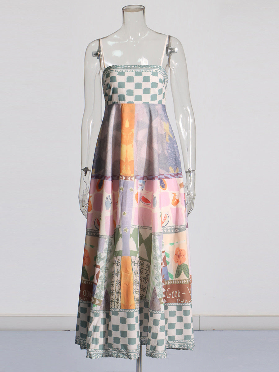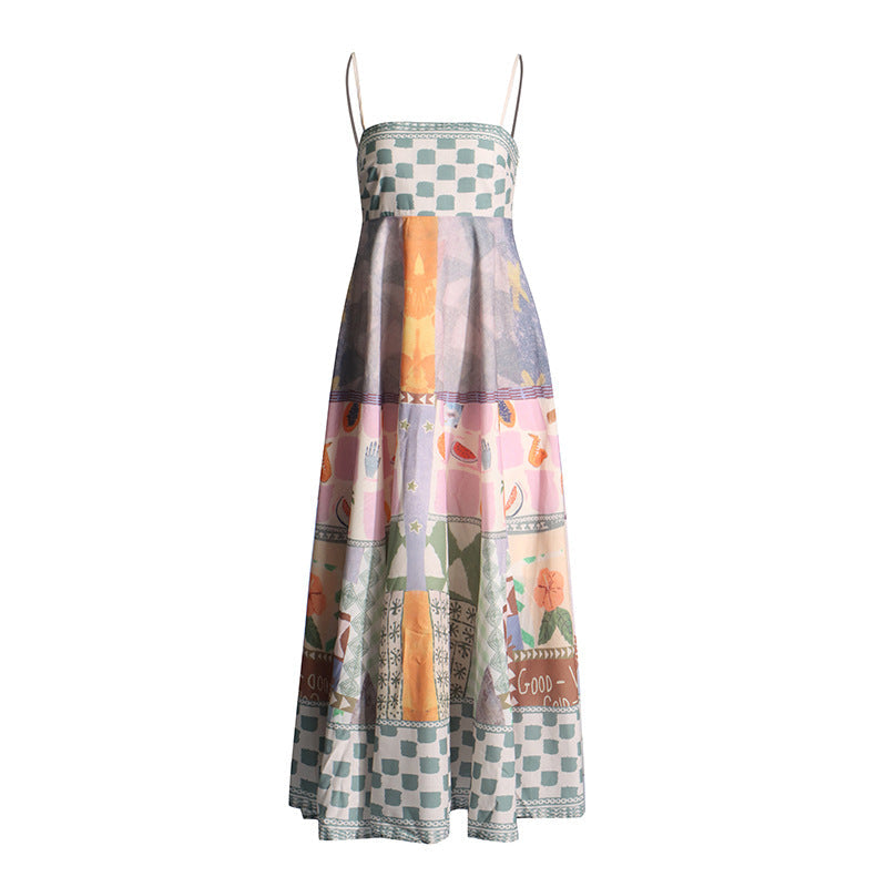 Spring Women's Dress 2025 New Retro Graffiti-Print Linen Sling Dress