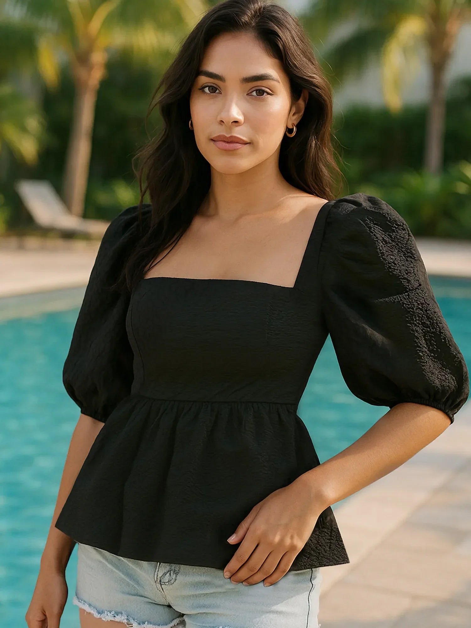 Square Neck Puff Sleeve Peplum Blouse DJPT