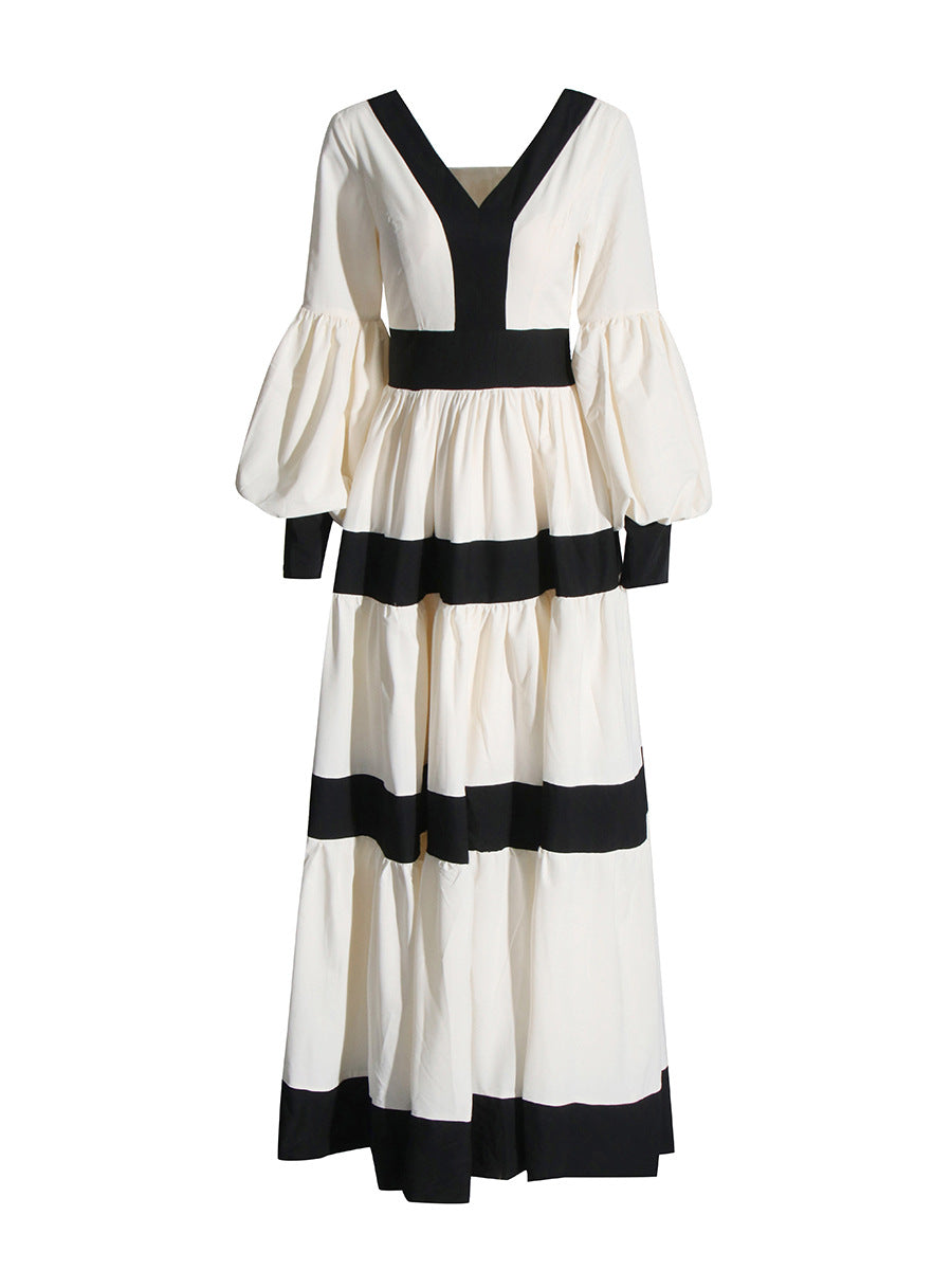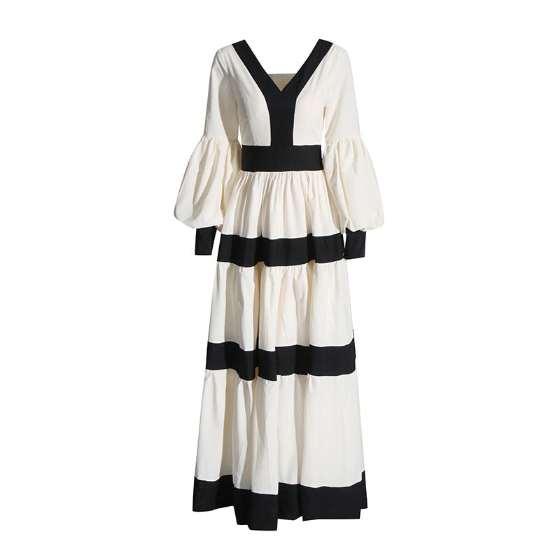 Style Dress Women's Dress 2025 Spring New V-Neck Lantern Sleeve Striped Splicing Fashion A-Word Dress