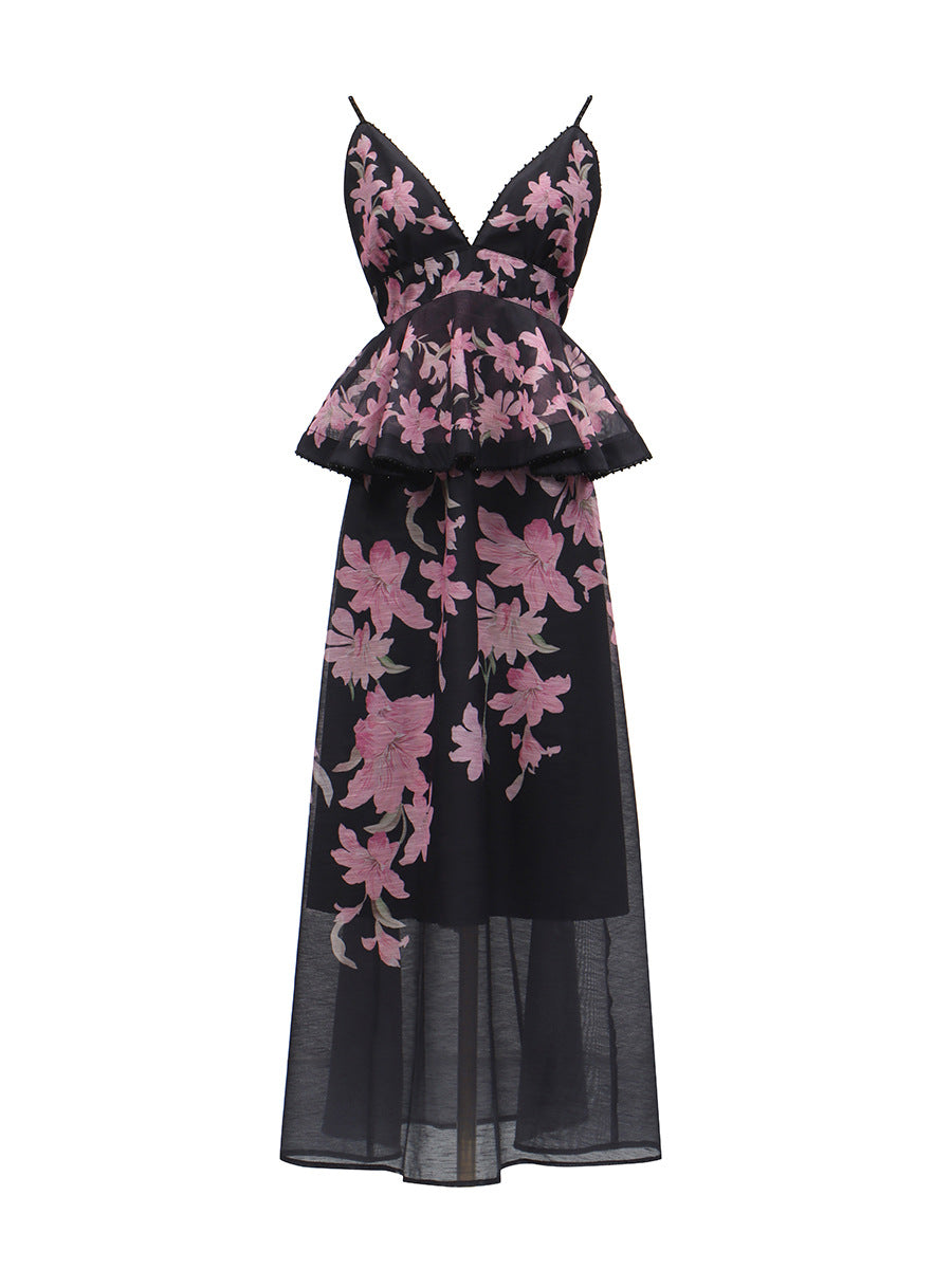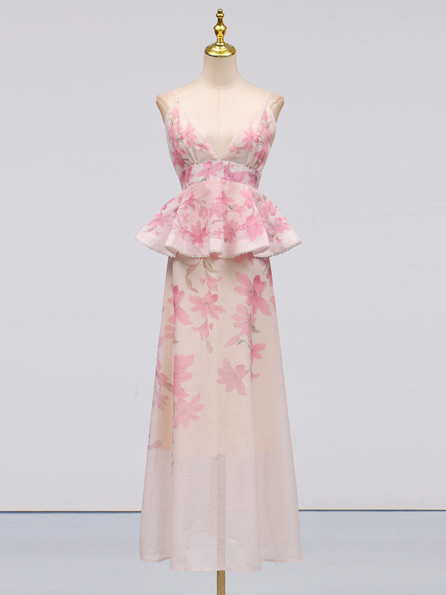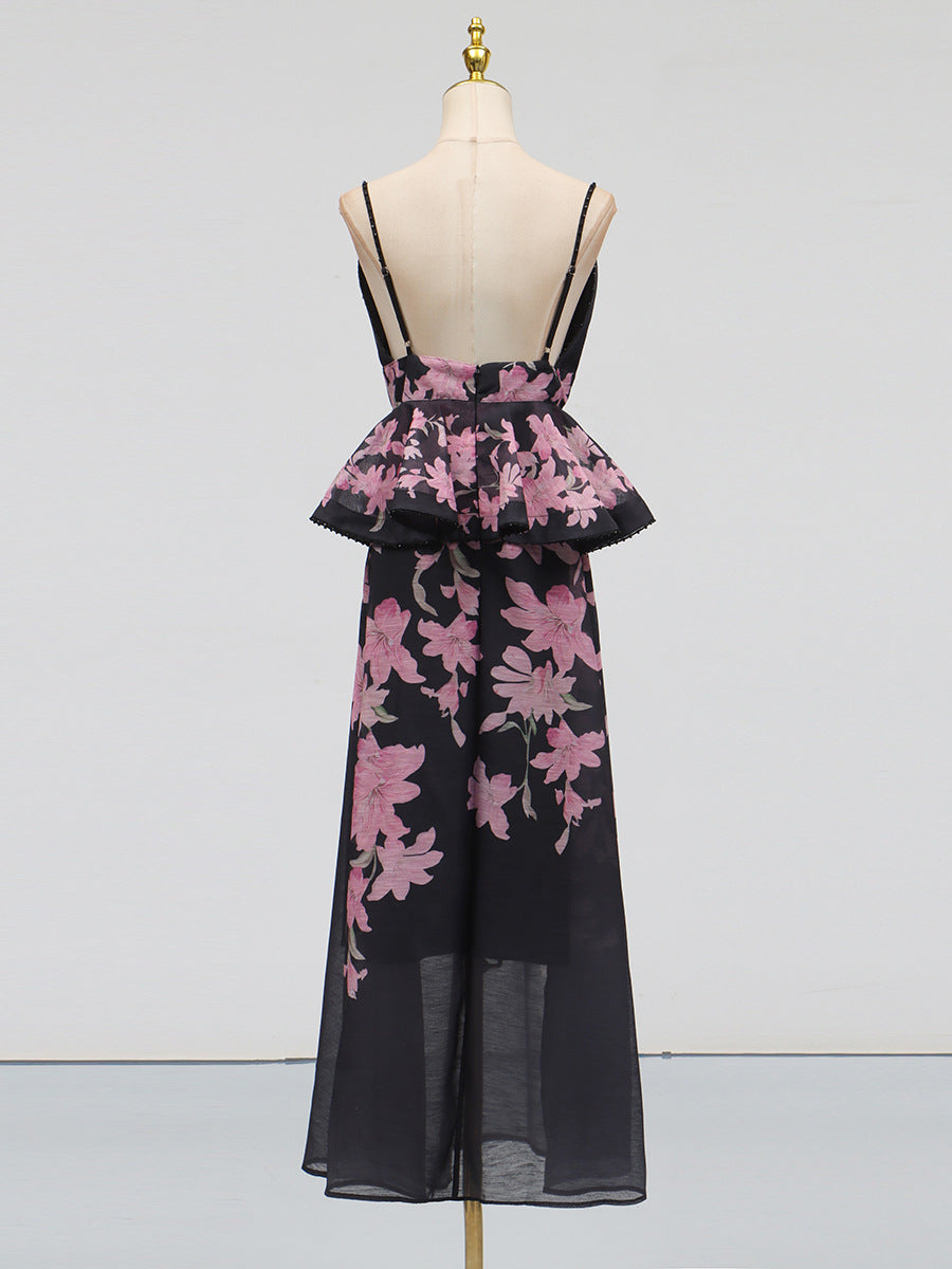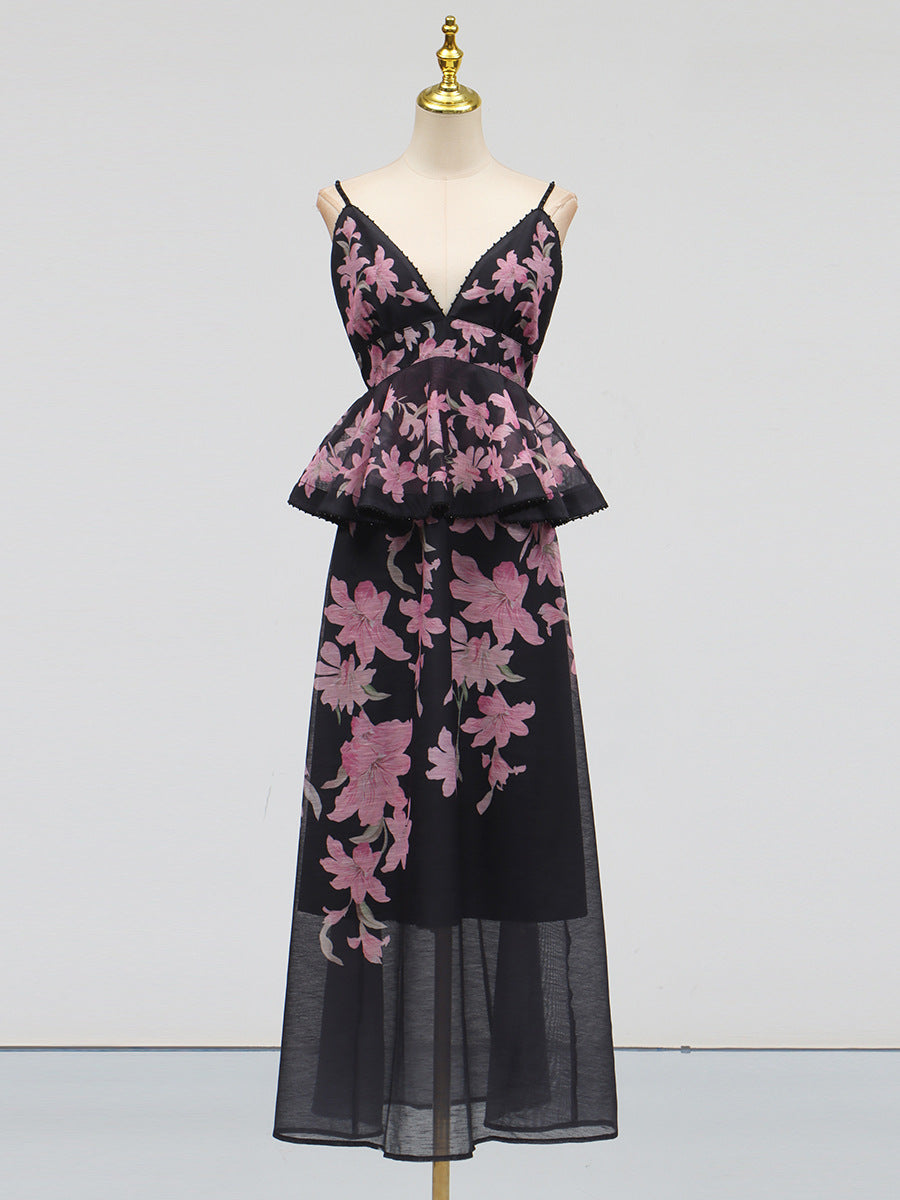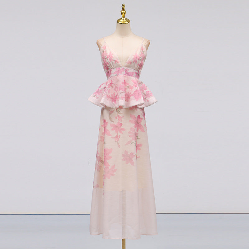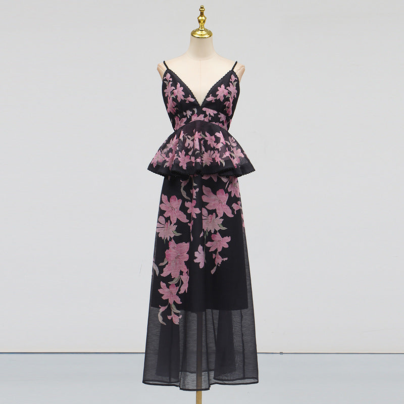 Style Long Print Sling Skirt 2025 New Lotus Leaf Side To Receive Waist High Dress Women's Summer