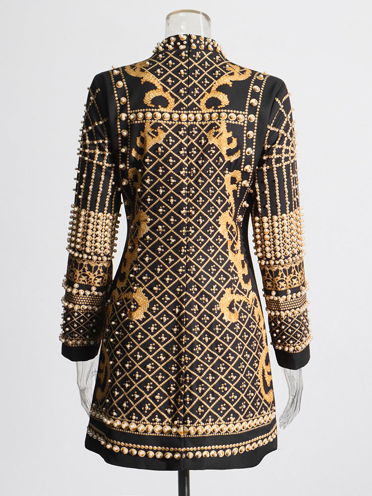 Style Retro Heavy Industry Nail Bead Design Short Dress 2025 Spring New Standing Back Print Dress Woman