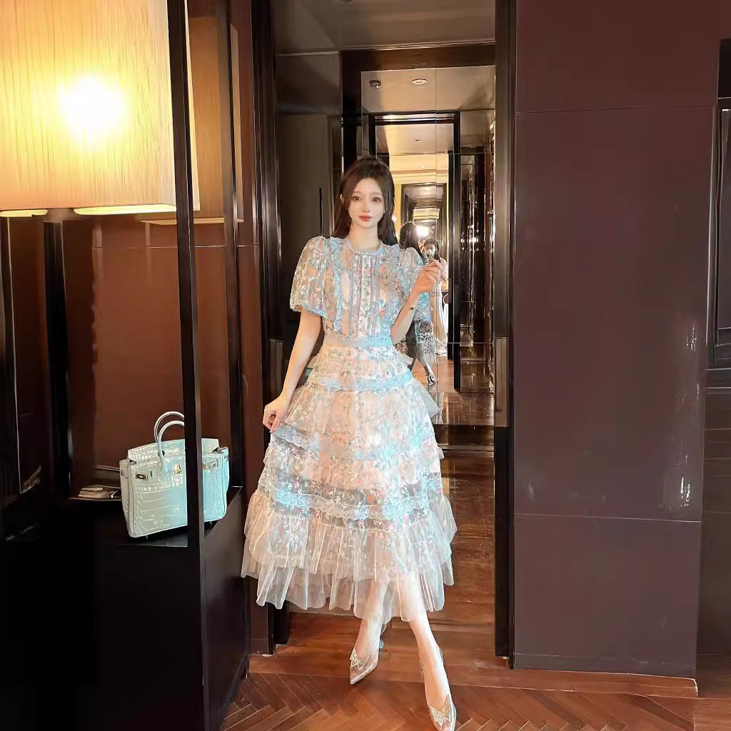 Summer Collar Splicing Flower Mesh Embroidery Cake Dress Dress