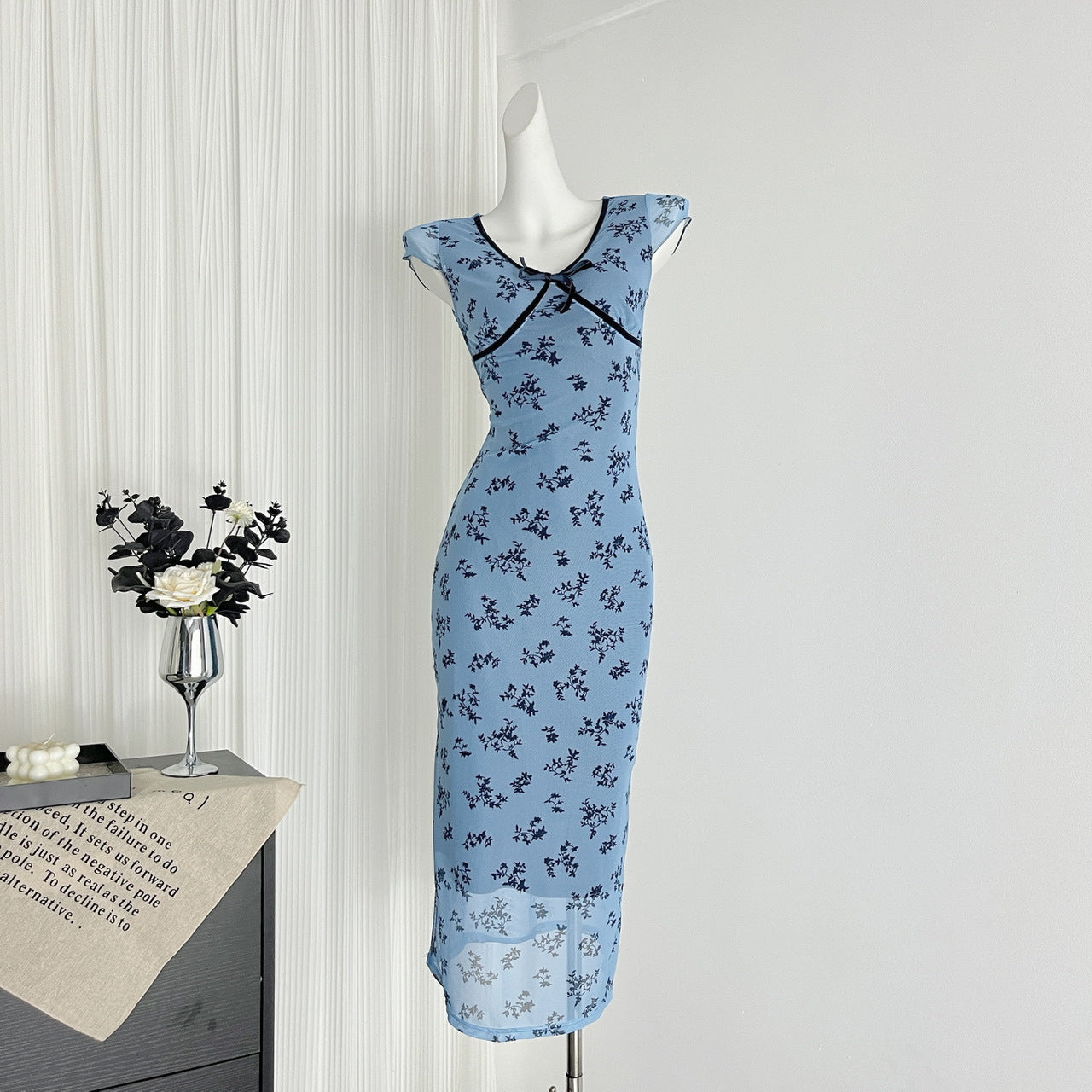 Summer New Retro Deep V Shredded Floral Dress Women's Waist Net Bow Bow A Skirt Skirt