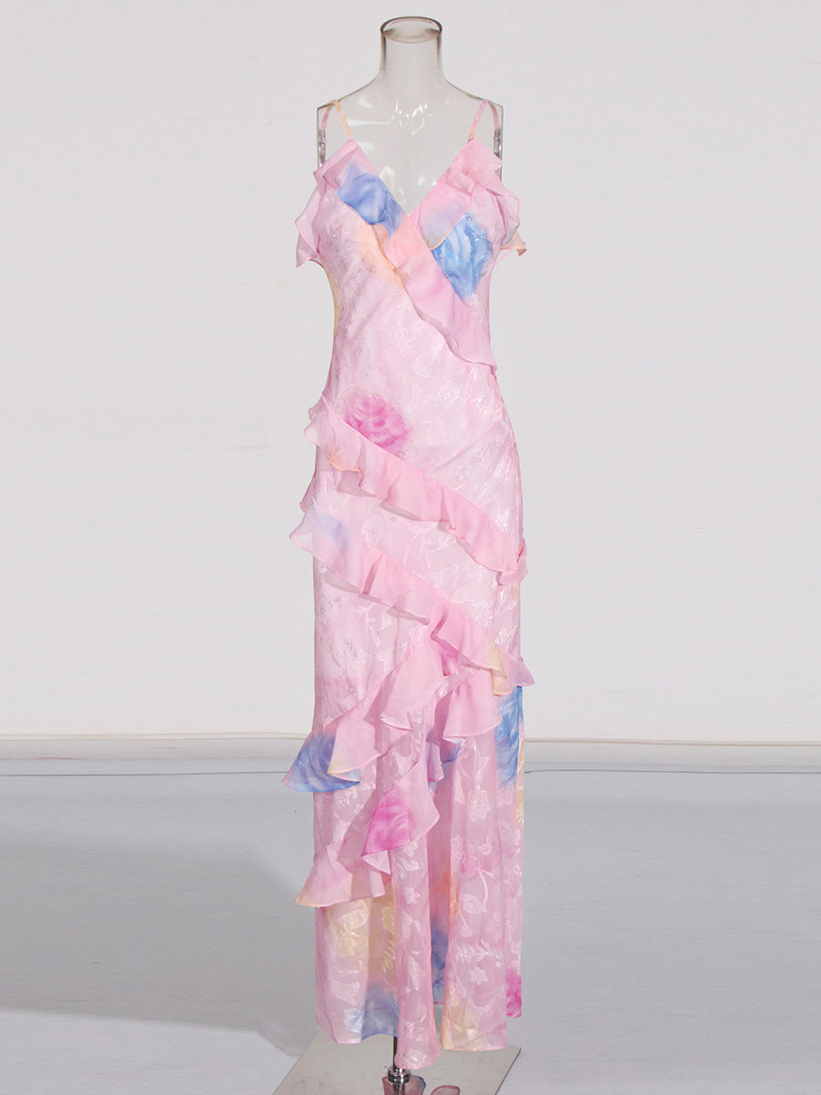 Suspension Dresses Spring 2025 New Fashion Pink-Print Leaf-Side Dress Woman
