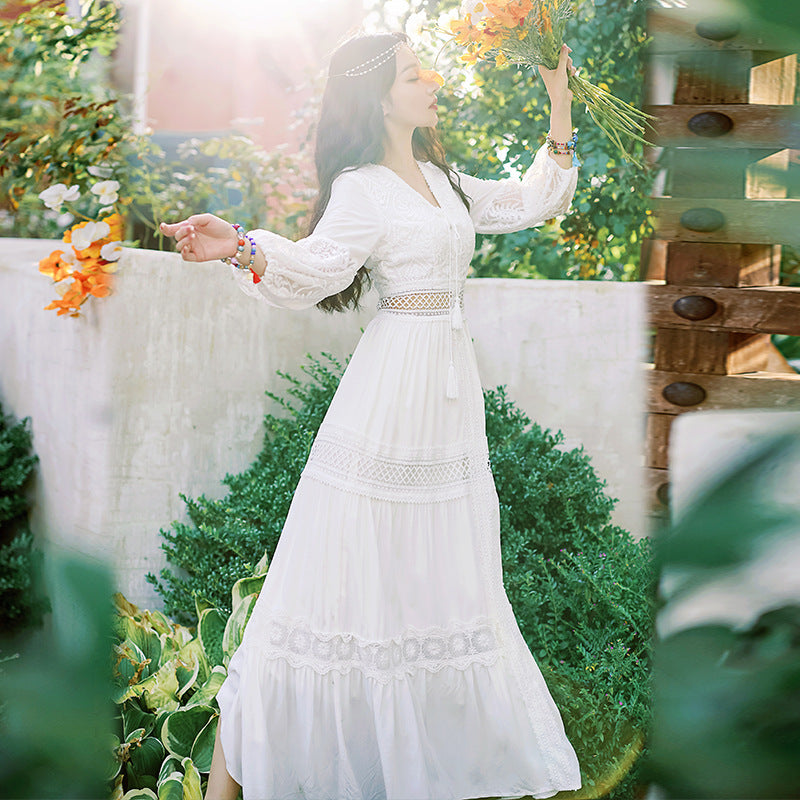 Tibet Tourism Wearing Skirt Heavy Industry Hollow Design White Dress Seaside Sanya Travel Beach Dress
