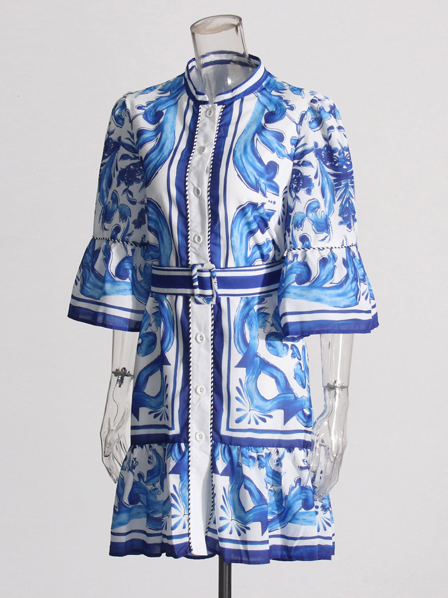 Vintage 2025 Summer New Round-Neck Long Horn Sleeve Blue Printed Dress Woman