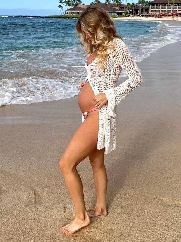 White 2-in-1 3D Flower Tie Ruffle Slit Flare Sleeve Fashion Beach Vacation Cover Up Photoshoot Maternity Mini Dress Maternity