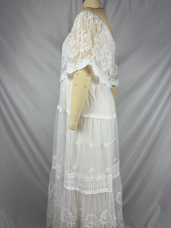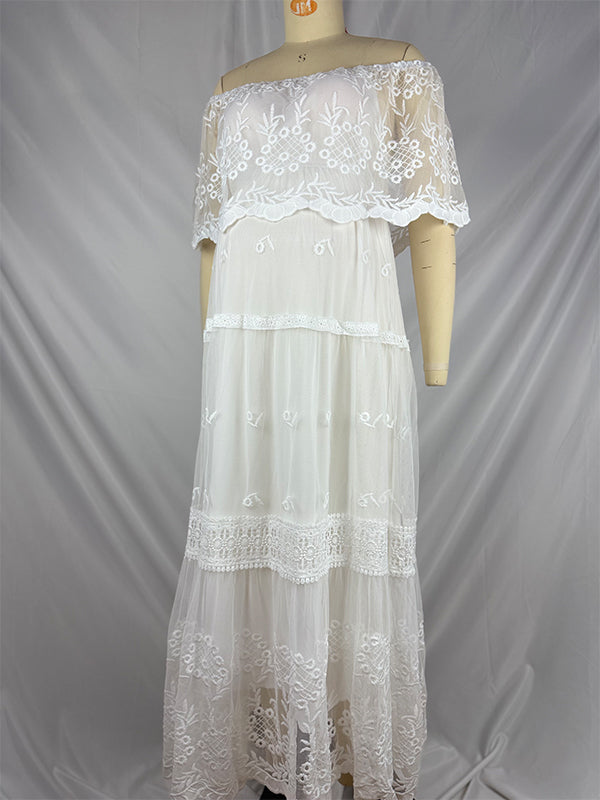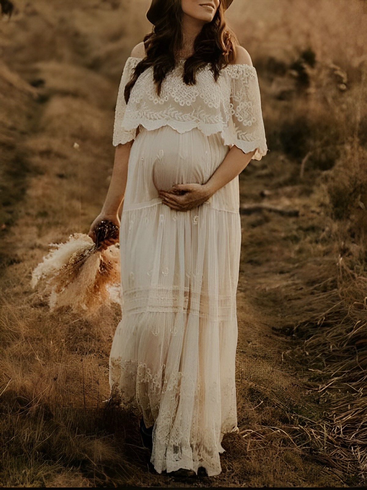 White Off Shoulder Lace Tiered Boat Neck Flowy Elegant Maternity Photoshoot Dress Maternity
