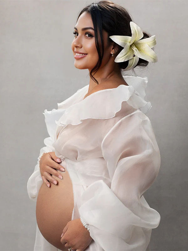 White Ruffle Open Slit Lantern Sleeve Elegant Photoshoot Maternity Maxi Dress Maternity