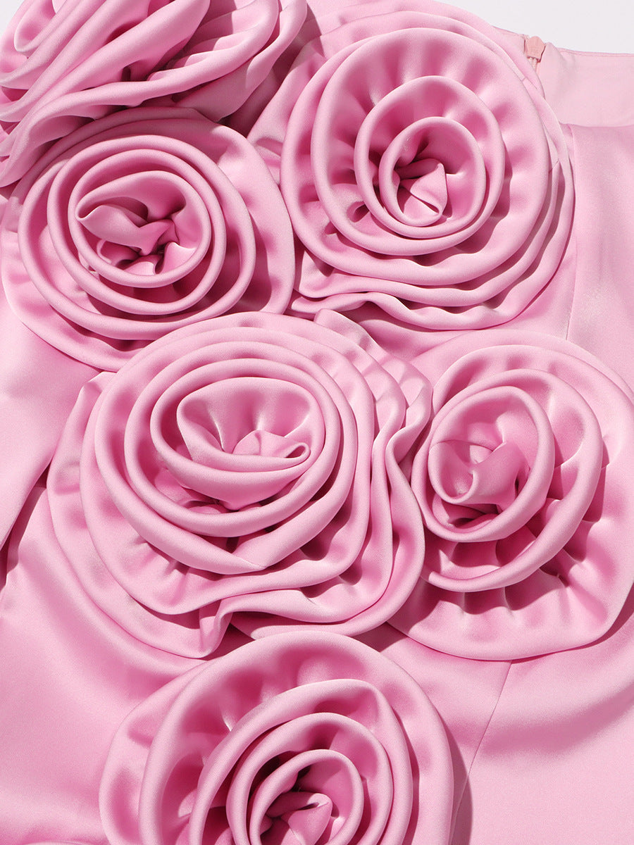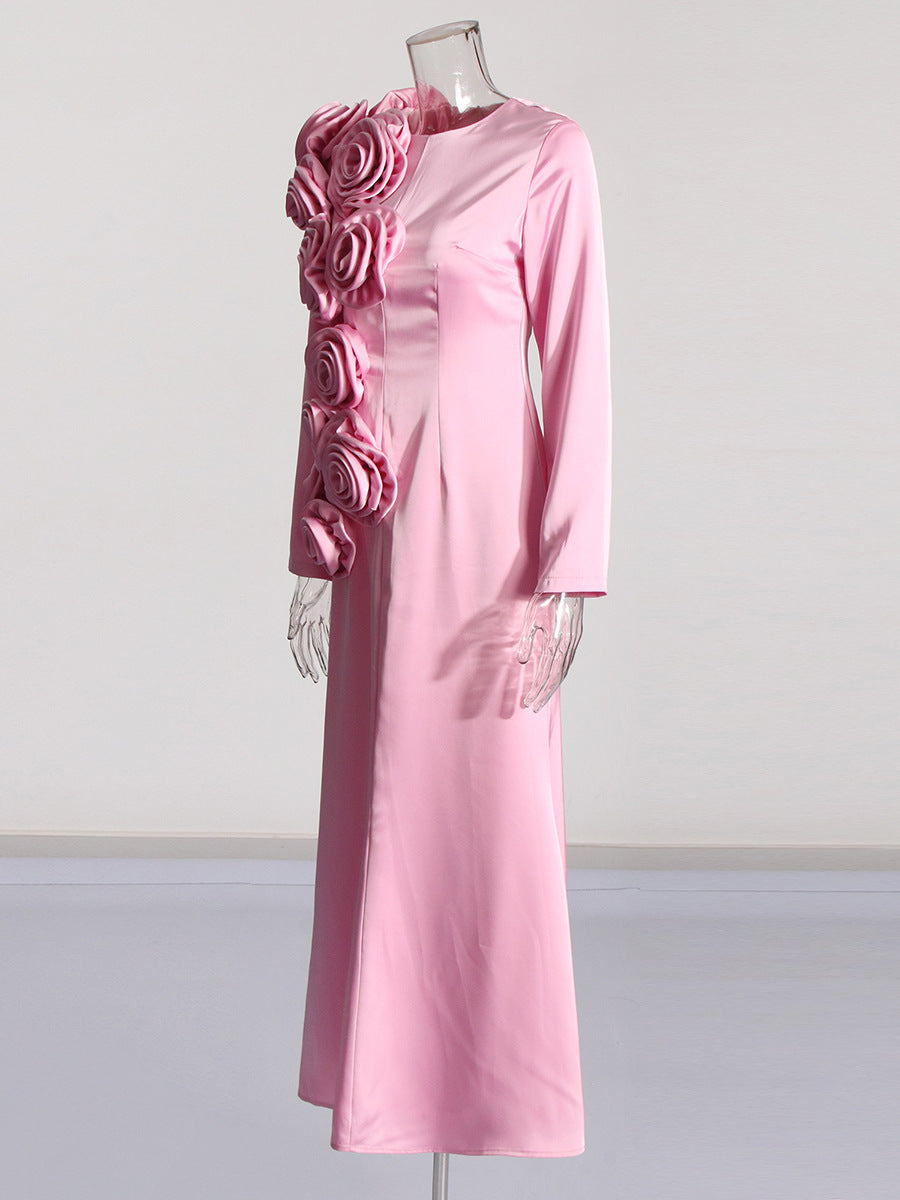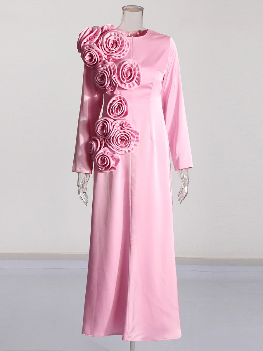 Wind Party Dress 2025 Summer New Round Neck Side Three-Dimensional Flowers Decorated Solid Color Repair Dress Dress Woman