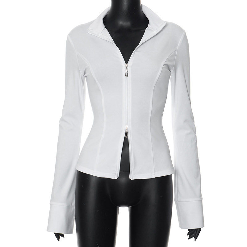 Women's Clothing 2024 Summer Solid Color Collar High-Rise Body-Clamping Long-Sleeved Zip-Up Top DJPT