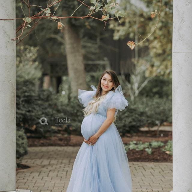 Women's Clothing Splicing Mesh Yarn Fluttering Shoulders Forked Pregnant Woman Drag Dress Photo Drag Floor Dress 1227 Maternity