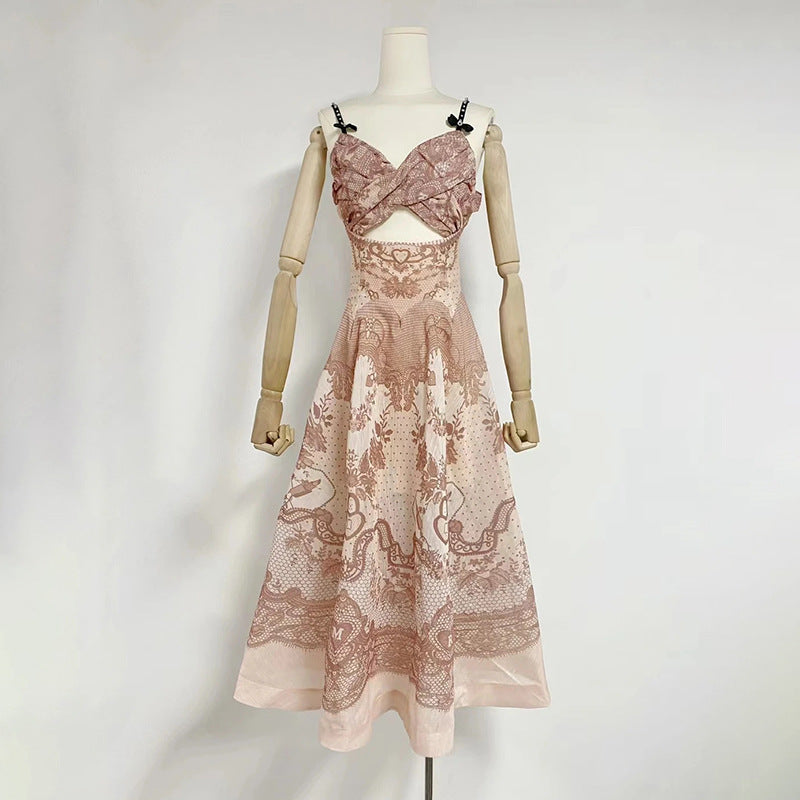 Women's Dress 2025 Spring New Women's Dress Slings Breasts Printed Waist Lotus Leaf Side Short Skirt