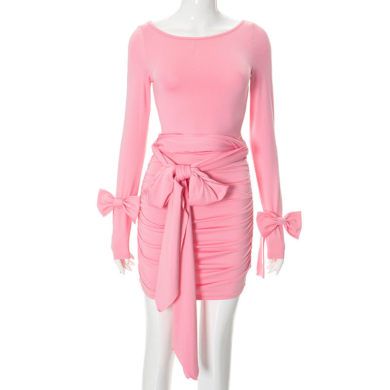 Women's Long-Sleeved Bow Decoration Folded Buttos With Short Skirt DJPT