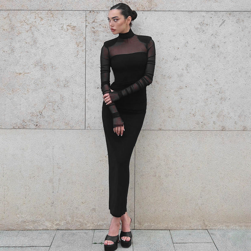 Women's Mesh Splicing Set Of Finger Long Sleeves High-Necked Ass Long Skirt DJPT